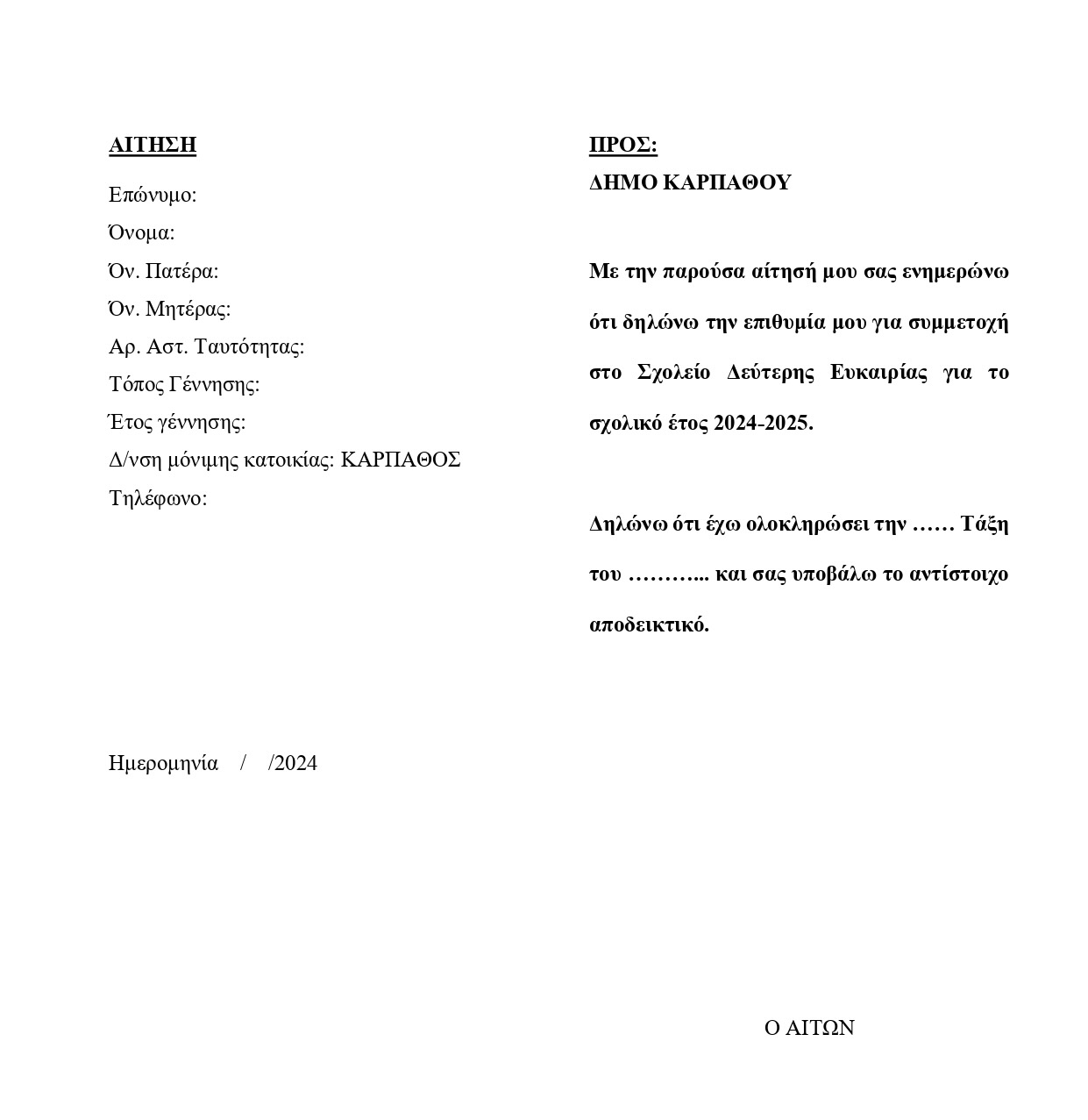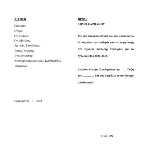 Για το λόγο αυτό παρακαλούνται οι ενδιαφερόμενοι όπως καταθέσουν την αίτηση τους στο Πρωτόκολλο του Δήμου Καρπάθου μέχρι και την Τρίτη 30 Απριλίου 2024, αυτοπροσώπως ή μέσω email :protokollo@karpathos.gr.
