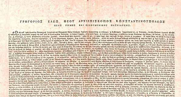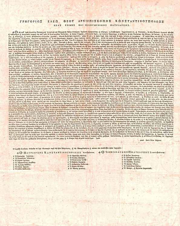 Αντί λοιπόν φιλελευθέρων εφάνησαν μισελεύθεροι, και αντί φιλογενών και φιλοθρήσκων εφάνησαν μισογενείς, μισόθρησκοι και αντίθεοι, διοργανίζοντες, φευ, οι ασυνείδητοι με τα απονενοημένα κινήματά των την αγανάκτησιν της ευμενούς κραταιάς βασιλείας εναντίον των ομογενών μας υπηκόων της, και σπεύδοντες να επιφέρωσι κοινόν και γενικόν τον όλεθρον εναντίον παντός του γένους. Και αγκαλά είναι γνωστόν, ότι, όσοι είναι κατηρτισμένοι τω όντι εις την ευσέβειαν, όσοι νουνεχείς και τίμιοι και των ιερών κανόνων και θείων νόμων ακριβείς φύλακες δεν θέλουν δώσει ευηκοιαν εις τας ψευδολογίας των αχρείων εκείνων και κακόβουλων• επειδή όμως είν’ ενδεχόμενον να σηνηρπάσθησάν τινές και παρασυρθώσι και άλλοι, διά τούτο προκαταλαμβάνοντες εκ προνοίας εκκλησιαστικής υπαγορεύομεν πάσιν υμίν τα σωτήρια, και γράφοντες μετά των περί ημας ιερωτάτων συναδελφών, του μακαριωτάτου πατριάρχου των Ιεροσολύμων, των εκλαμπροτάτων και περιφανεστάτων προυχόντων του γένους, των τιμιωτάτων πραγματευτών, των αφ’ εκάστου ρουφετίου προκριτωτέρων και όλων των εν τη βασιλευούση ορθοδόξων μελών εκάστης τάξεως και εκάστου βαθμού, συμβουλεύομεν και παραινούμεν και εντελλόμεθα και παραγγέλλομεν πάσιν υμίν τοις κατά τόπον αρχιερεύσι, τοις ηγουμένοις των ιερών μοναστηρίων, τοις ιερεύσι των εκκλησιών, τοις πνευματικοίς πατράσι των ενοριών, τοις προεστώσι και ευκαταστάτοις των κωμοπόλεων και χωρίων, και πάσιν απλώς τοις κατά τόπον προκρίτοις να διακηρύξετε την απάτην των ειρημένων κακοποιών και κακοβούλων ανθρώπων, και να τους αποδείξετε και να τους στηλιτεύσετε πανταχού ως κοινούς λυμεώνας και ματαιόφρονας, και να προσέχετε όσον το δυνατόν εις τας απάτας αυτών και ραδιουργίας, γινώσκοντες, ότι η μόνη απόδειξις της αθωότητος των είναι να εμφανίσωσιν όσα γράμματα λάβωσι τυχόν εις χείρας περί της αυτής υποθέσεως, ή ειδήσεις μάθωσι, και να παρρησιάσωσιν οι μεν ενταύθα εν βασιλευούση προς ημάς, οι δ’ εν τοις έξω μέρεσιν εις τους κατά τόπον αρχιερείς και τους διοριζομένους παρ’ ημών εκκλησιαστικούς εξάρχους και τους βασιλικούς εξουσιαστάς και διοικητάς, δηλοποιούντες και παραδίδοντες και εκείνους τους απλουστέρους, όσοι ήθελαν φωραθή ότι ενεργούν ανοίκεια του ρεαγιαδιακού χαρακτήρος, καθότι οι τοιούτοι διαταράττουσι την γενικήν ησυχίαν, και κατακρημνίζουσι τους αδυνάτους και αθώους ομογενείς μας εις της απωλείας το βάραθρον.