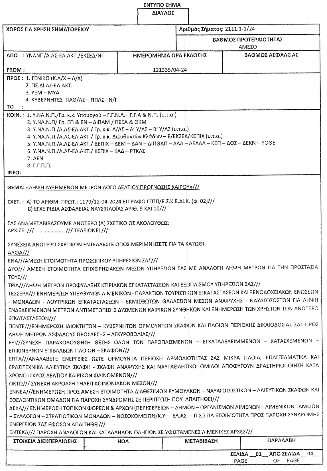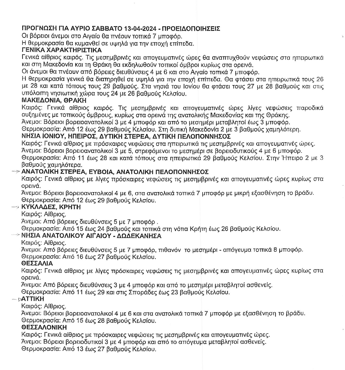 Το Λιμεναρχείο Καρπάθου εξέδωσε ανακοίνωση να αυξηθούν τα μέτρα λόγω αναγγελία θυελλωδών ανέμων σήμερα 13/4/2024.