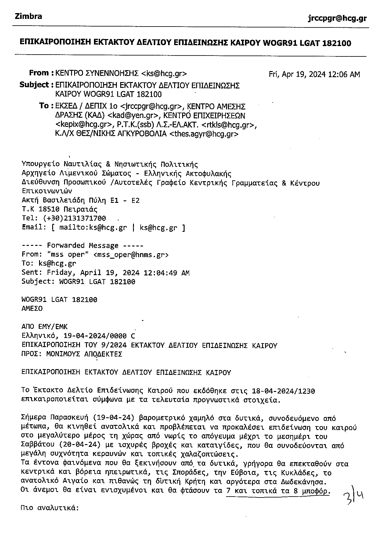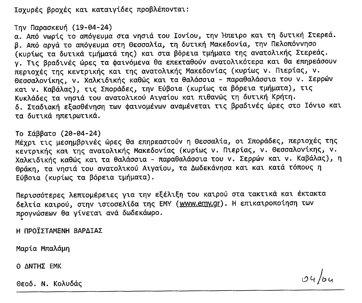 Αύριο Παρασκευή (19-04-24) βαρομετρικό χαμηλό στα δυτικά, συνοδευόμενο από μέτωπα, θα κινηθεί ανατολικά και προβλέπεται να προκαλέσει επιδείνωση του καιρού στο μεγαλύτερο μέρος τη χώρας από τις απογευματινές ώρες της Παρασκευής μέχρι το μεσημέρι του Σαββάτου (20-04-24) με ισχυρές βροχές και καταιγίδες, που θα συνοδεύονται από μεγάλη συχνότητα κεραυνών και τοπικές χαλαζοπτώσεις.