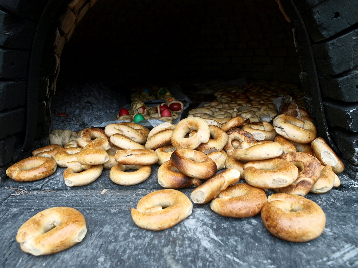 Η κυρία Καλλιόπη σπρώχνει τη στάχτη στην άκρη, για να κρατά ζωντανή τη θέρμη του φούρνου, και αρχίζει να βάζει με τον «φτίο» τα κουλούρια που παίρνει από το «πλαστελί». Γρήγορα τα κουλούρια παίρνουν ένα ορεκτικό, ροδοκόκκινο χρώμα, και όταν ψηθούν τελείως, τα σωριάζει μπροστά στο έμπα του φούρνου. Πίσω, που ο φούρνος είναι πιο πυρωμένος, βάζει τα ταψιά με τους πολύχρωμους «πούλους».