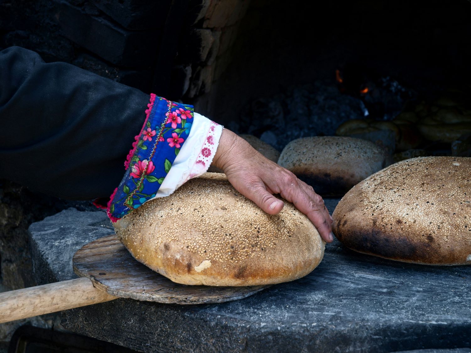 Στην Όλυμπο δεν υπάρχει δημόσιος «ευρωπαϊκός» φούρνος που να προμηθεύει τη μικρή κοινότητα ψωμί. Κάθε εβδομάδα, η κάθε οικογένεια πρέπει να ζυμώσει, να φέρει κλαδιά και να φουρνίσει το ψωμί της στο φούρνο της γειτονιάς, με τα ίδια της τα χέρια. Όλοι συμμετείχαν, με το όργωμα, τη σπορά, το θέρισμα, το ξαχέρισμα, το άλεσμα, το μάζεμα των ξύλων, το ζύμωμα, το πλάσιμο, το φούρνισμα. Η κυρία Καλλιόπη, που, τώρα, κουβαλά στο κεφάλι της το δεμάτι με τα «φρούανα», τα κλαδιά του πεύκου που μοσχοβολούν ρετσίνι όταν καίγονται, με τα οποία θα πυρώσει το φούρνο, αναλογεί μεγάλο βάρος της διατήρησης αυτής της κουλτούρας ζωής, καθώς, πλέον, μοιράζεται σε πολύ λίγους.