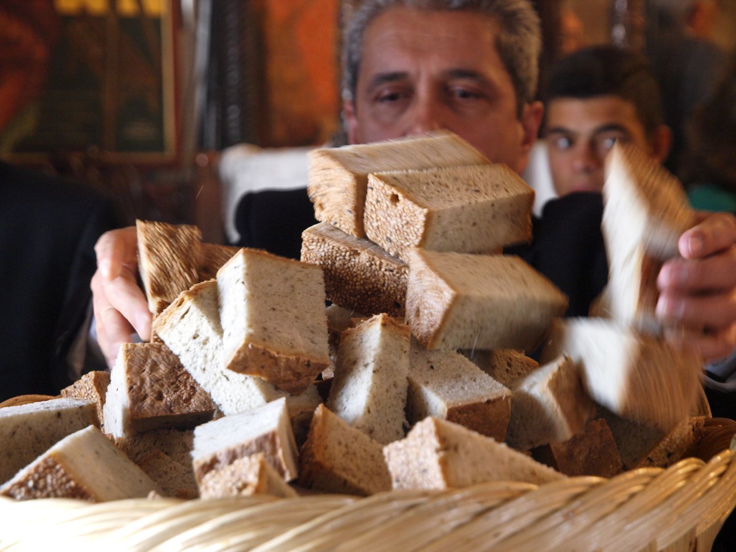 Όπως αυτός που ευλογείται τώρα στο κέντρο της ατμοσφαιρικής εκκλησιάς, στην ακολουθία της Δεύτερης Ανάστασης το απόγευμα της Κυριακής του Πάσχα. Αυτός που θα τεμαχιστεί και θα μοιραστεί συμβολικά στους πιστούς, ως, πραγματικός, ευλογημένος άρτος ζωής. Όπως και το αντίδωρο που μοιράζει ο παπα-Γιάννης από την Ωραία Πύλη μετά το πέρας της ακολουθίας, κόβοντας εκείνη την ώρα το επίσης προζυμένιο πρόσφορο με το μαχαίρι.