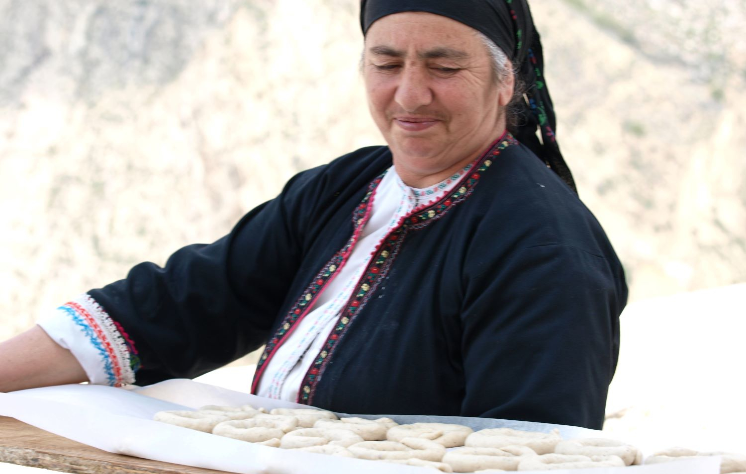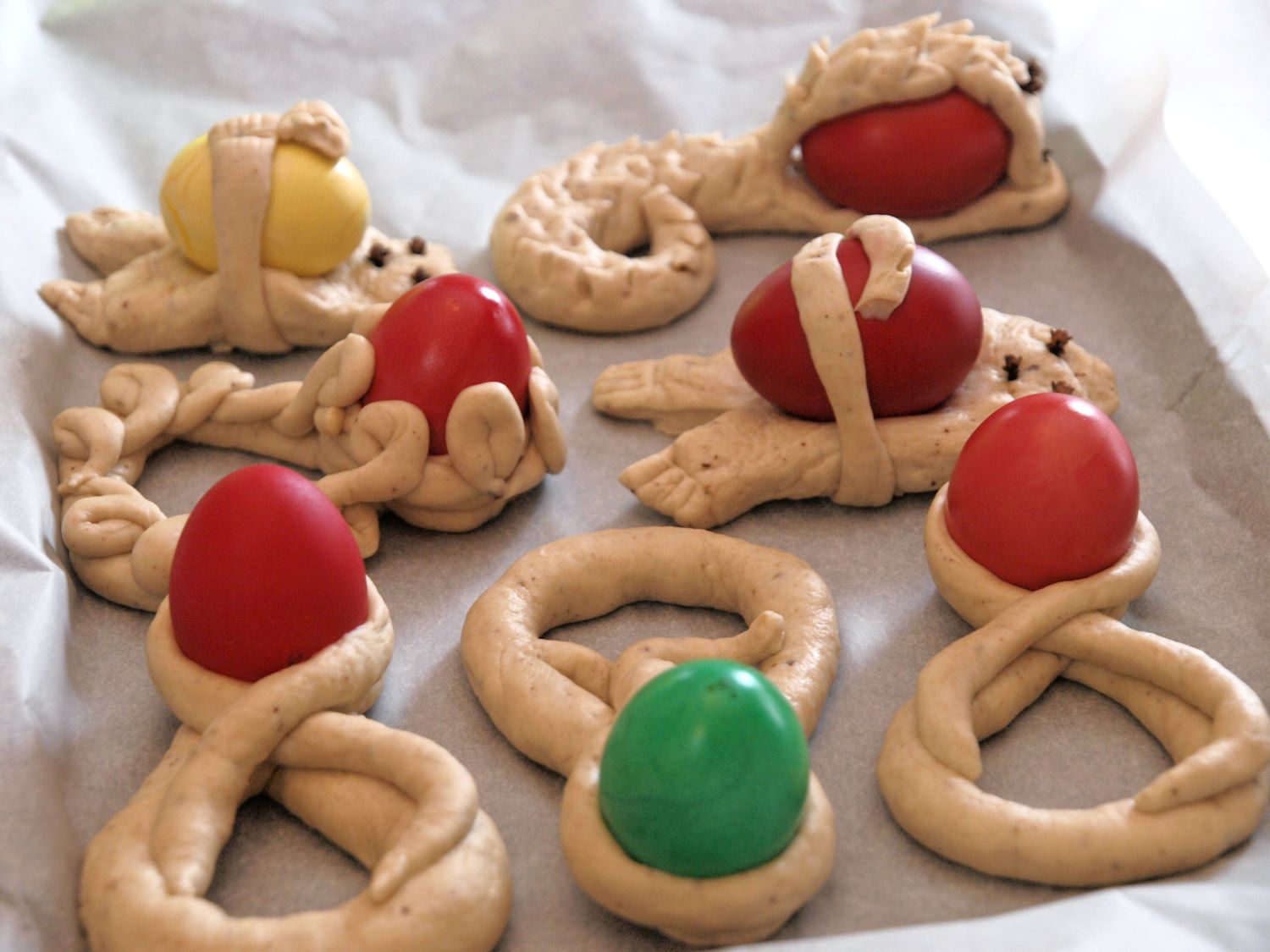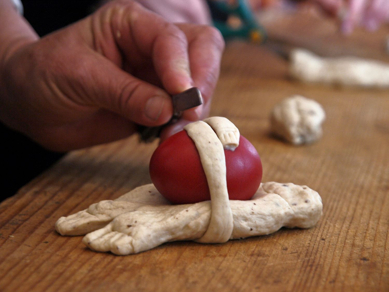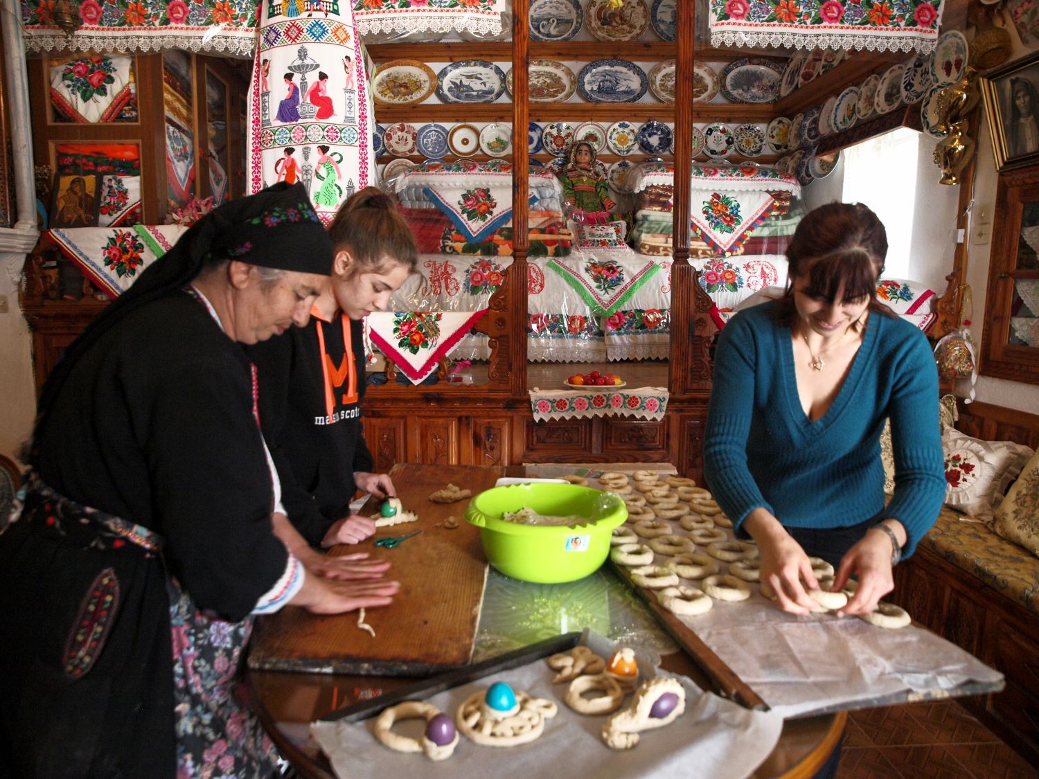 Αυτά τα έντονα χρώματα της φορεσιάς της Ολύμπου υπάρχουν διάχυτα και στην παραδοσιακά στολισμένη σάλα με το σουφά, όπου πάνω στο κεντρικό τραπέζι η Μαρία πλάθει κουλούρια και η κυρία Καλλιόπη μαζί με την εκπαιδευόμενη Δέσποινα πλέκουν «πούλους», τα πατροπαράδοτα πασχαλινά τσουρέκια με τα βαμμένα με έντονα χρώματα αβγά. «Έλα Χριστέ μου» είπε η κυρία Καλλιόπη και ξεκινά να πλάσει τα «πλουμία» με έναν «μακρύ» και έναν «λιανό» κλώνο ζύμης. Τα πλέκει γύρω από ένα κόκκινο αβγό, σχολιάζοντας με τον έκδηλο αυτοσαρκασμό της: «ο λωλός αγαπά τα κόκκινα».