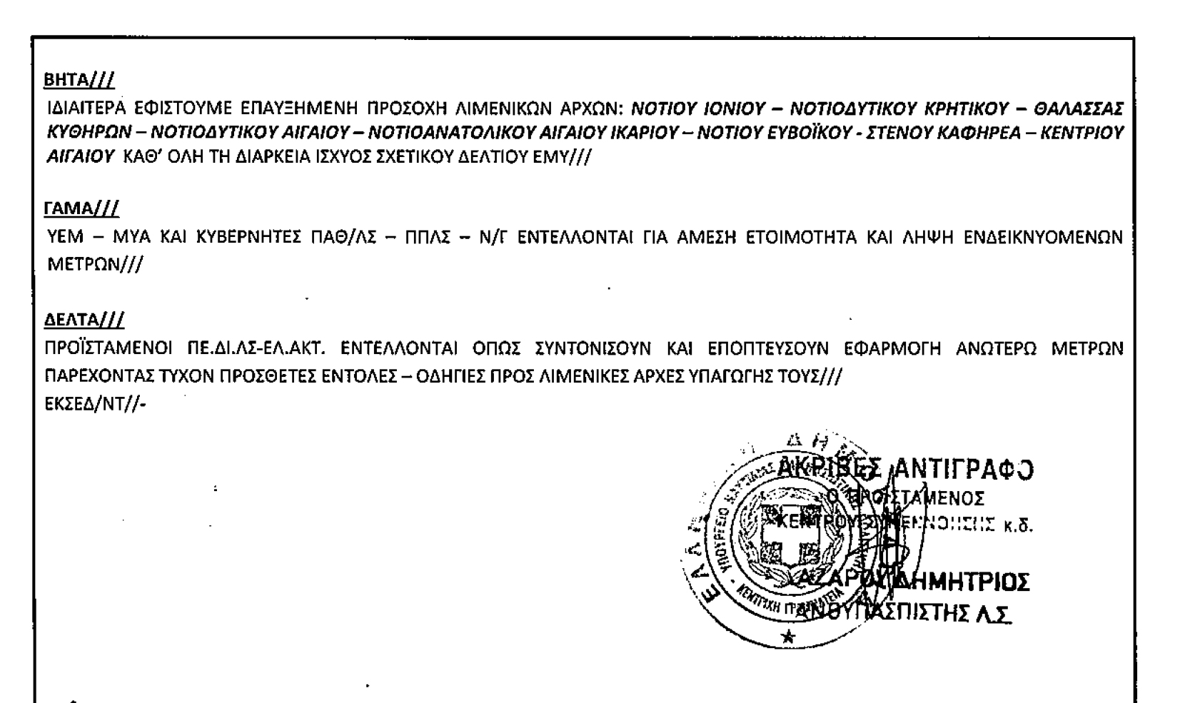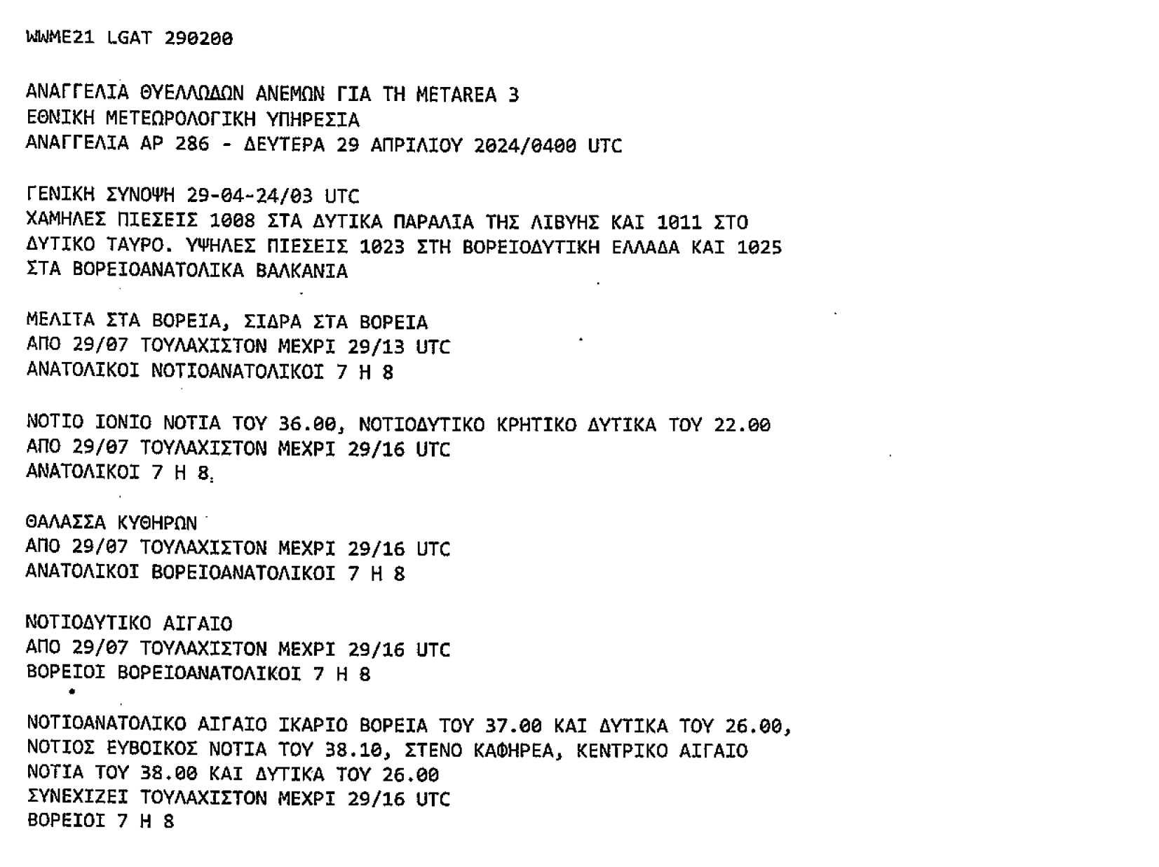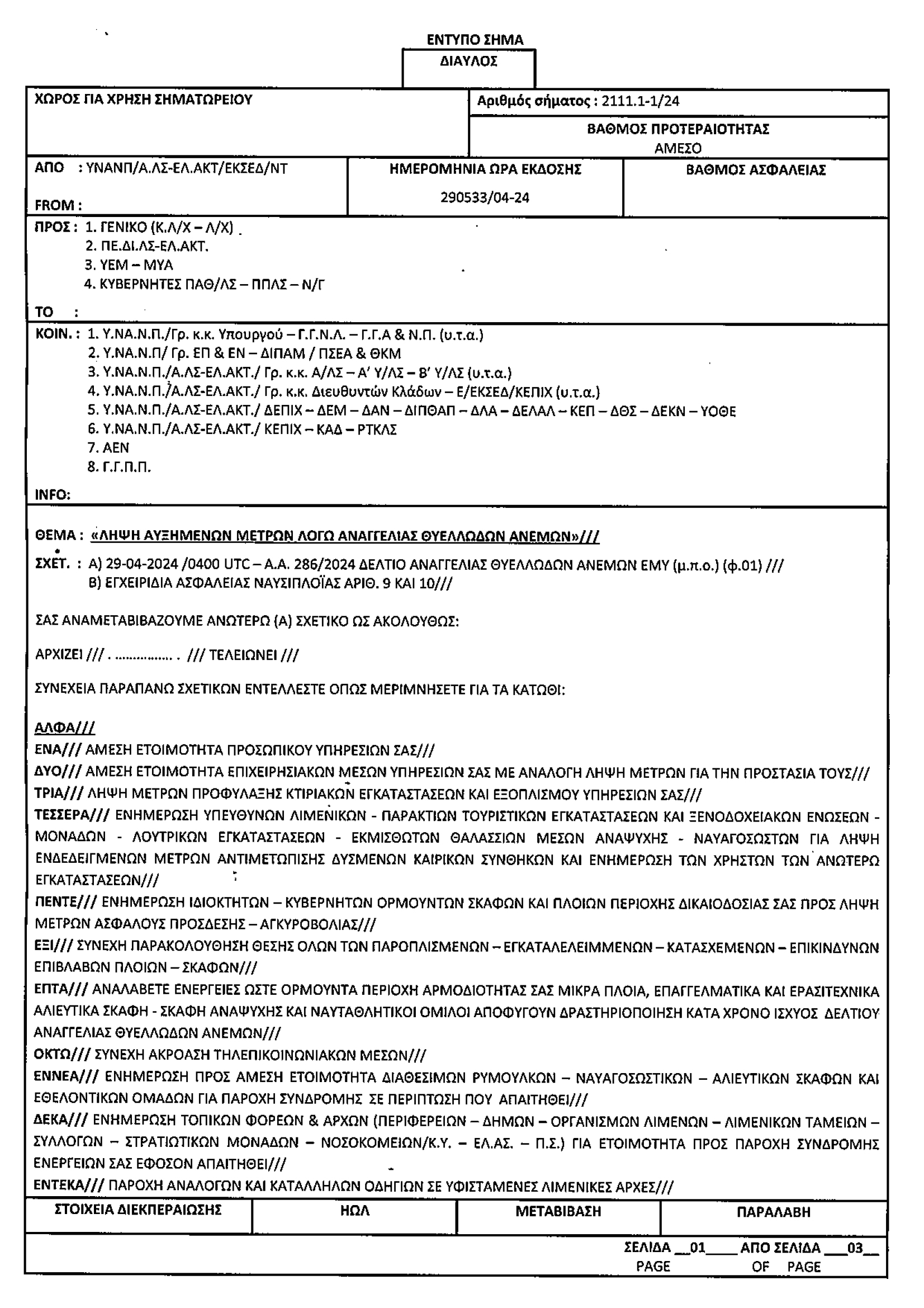 Το Λιμεναρχείο Καρπάθου εξέδωσε ανακοίνωση να αυξηθούν τα μέτρα λόγω αναγγελία θυελλωδών ανέμων 29/4/2024.