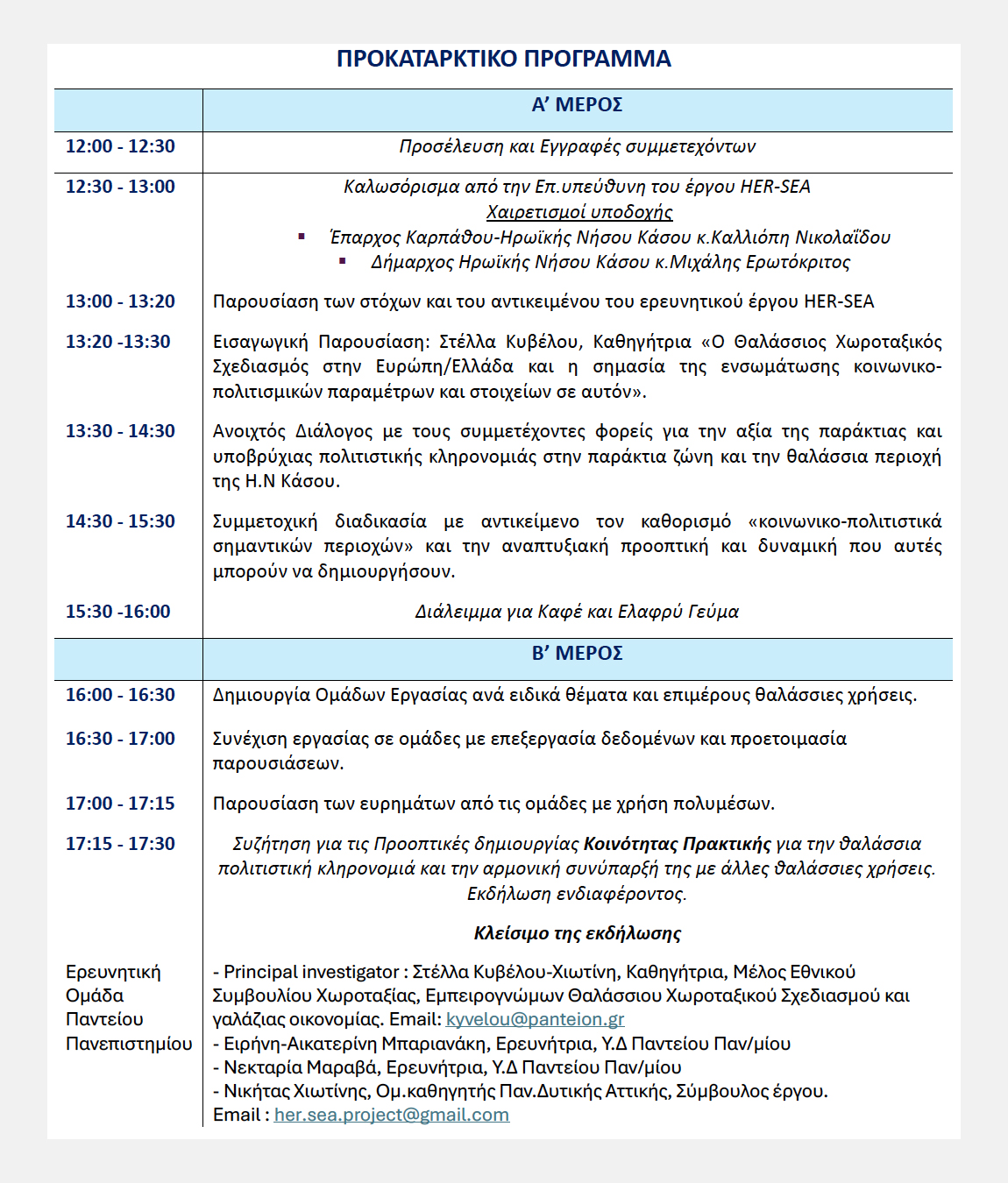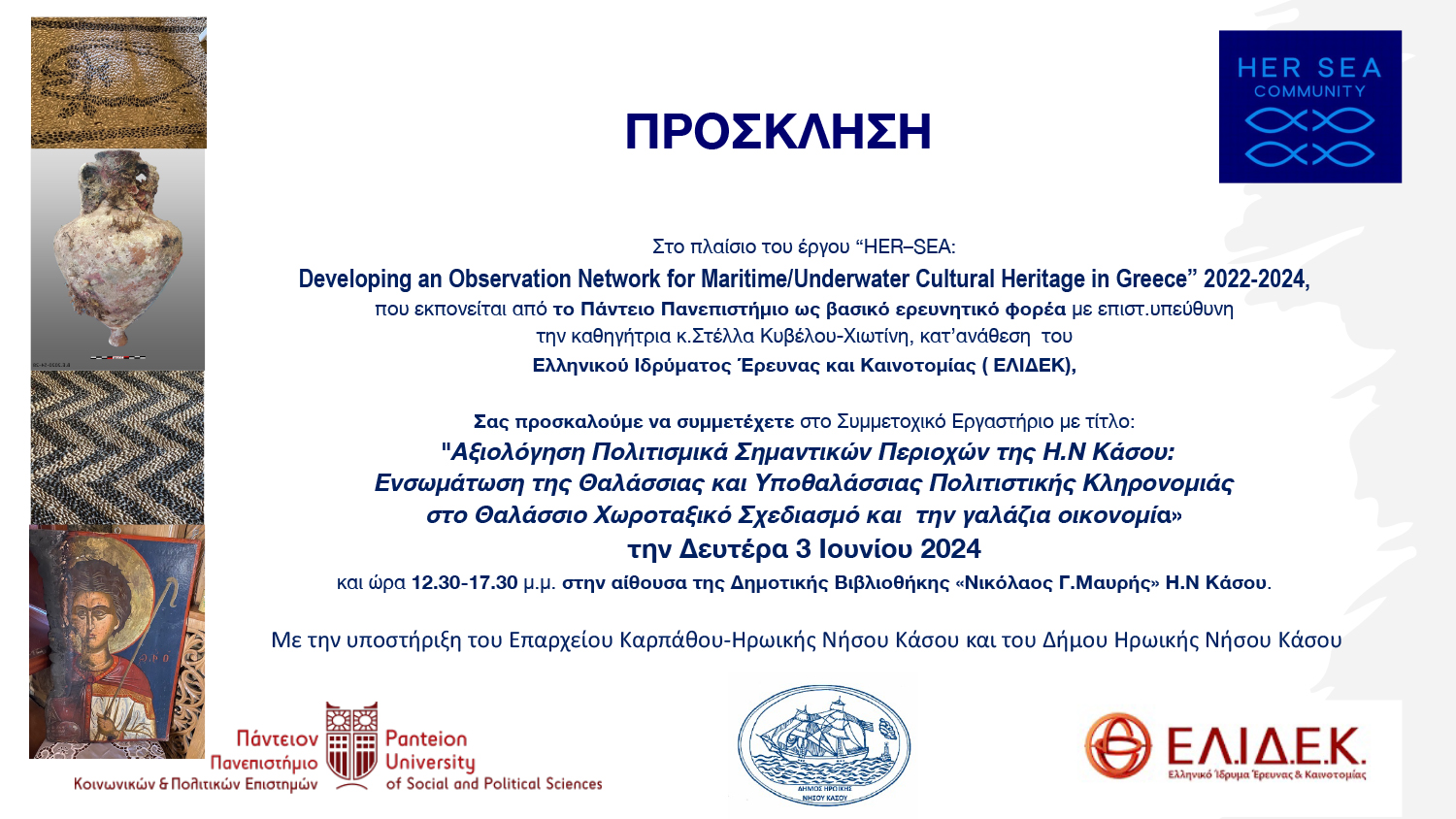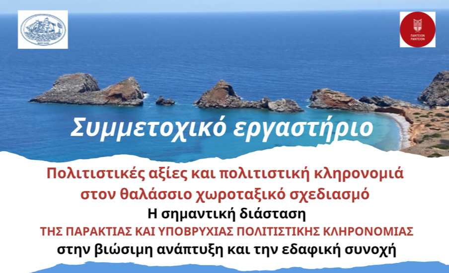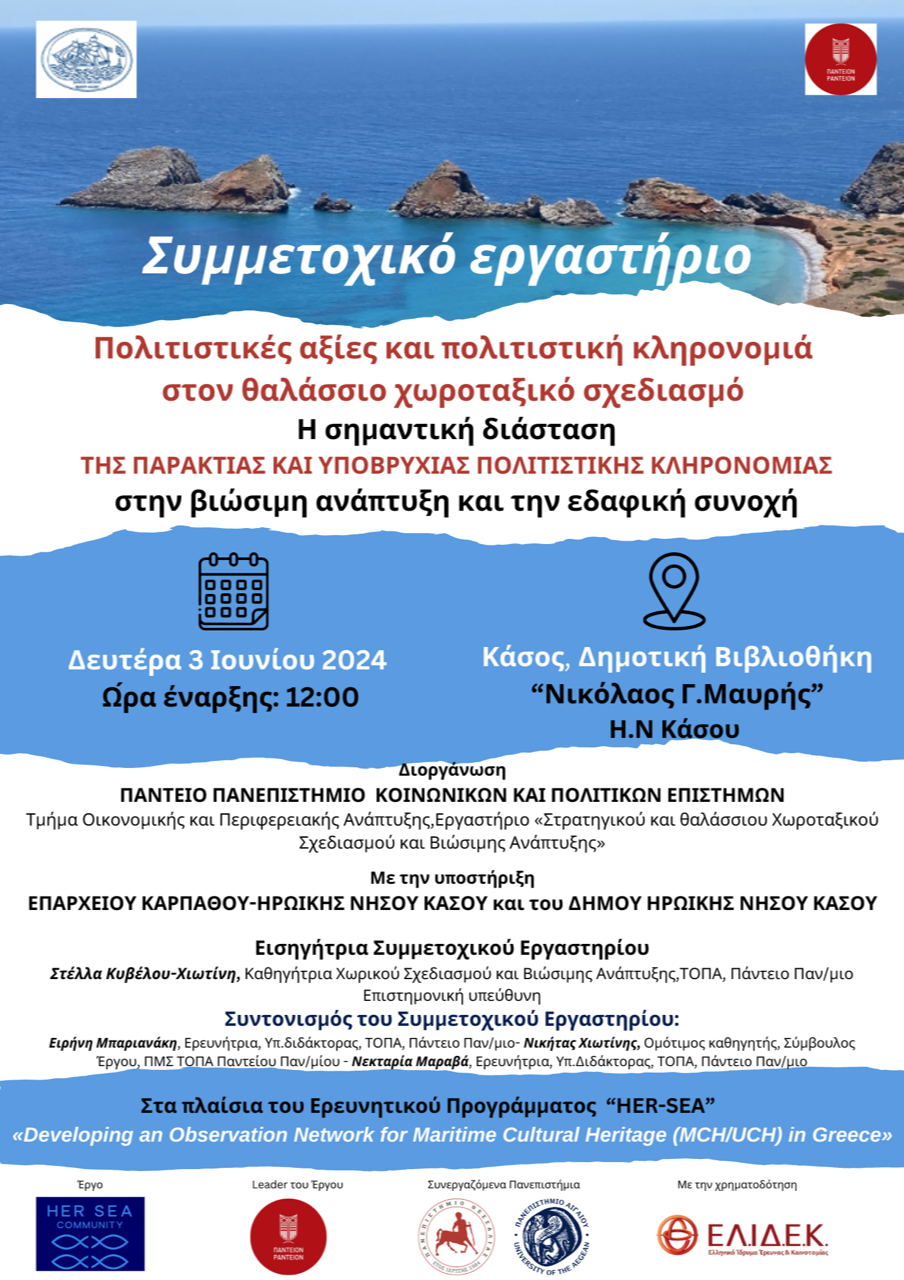 Στο πλαίσιο του ερευνητικού έργου «HER-SEA» – ΔΗΜΙΟΥΡΓΙΑ ΔΙΚΤΥΟΥ ΠΑΡΑΤΗΡΗΣΗΣ ΤΗΣ ΠΑΡΑΚΤΙΑΣ ΚΑΙ ΥΠΟΒΡΥΧΙΑΣ ΠΟΛΙΤΙΣΤΙΚΗΣ ΚΛΗΡΟΝΟΜΙΑΣ ΣΤΗΝ ΕΛΛΑΔΑ που χρηματοδοτείται από το Ελληνικό Ίδρυμα Έρευνας και Καινοτομίας (ΕΛΙΔΕΚ), Το Πάντειο Πανεπιστήμιο ως βασικός ερευνητικός φορέας (Επιστ.υπεύθυνη Καθηγήτρια Στέλλα Κυβέλου-Χιωτίνη), σας προσκαλεί να συμμετέχετε στο συμμετοχικό εργαστήριο με τίτλο: