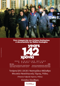 Στη Ρόδο θα βρίσκεται την Τετάρτη 5/6 ο Στέλιος Κούλογλου, όπου θα πραγματοποιηθεί προβολή του νέου του ντοκιμαντέρ, του δικαστικού θρίλερ «142 χρόνια». Το ντοκιμαντέρ προβάλλεται σε όλη την Ελλάδα συγκεντρώνοντας το μεγάλο ενδιαφέρον των τοπικών κοινωνιών.