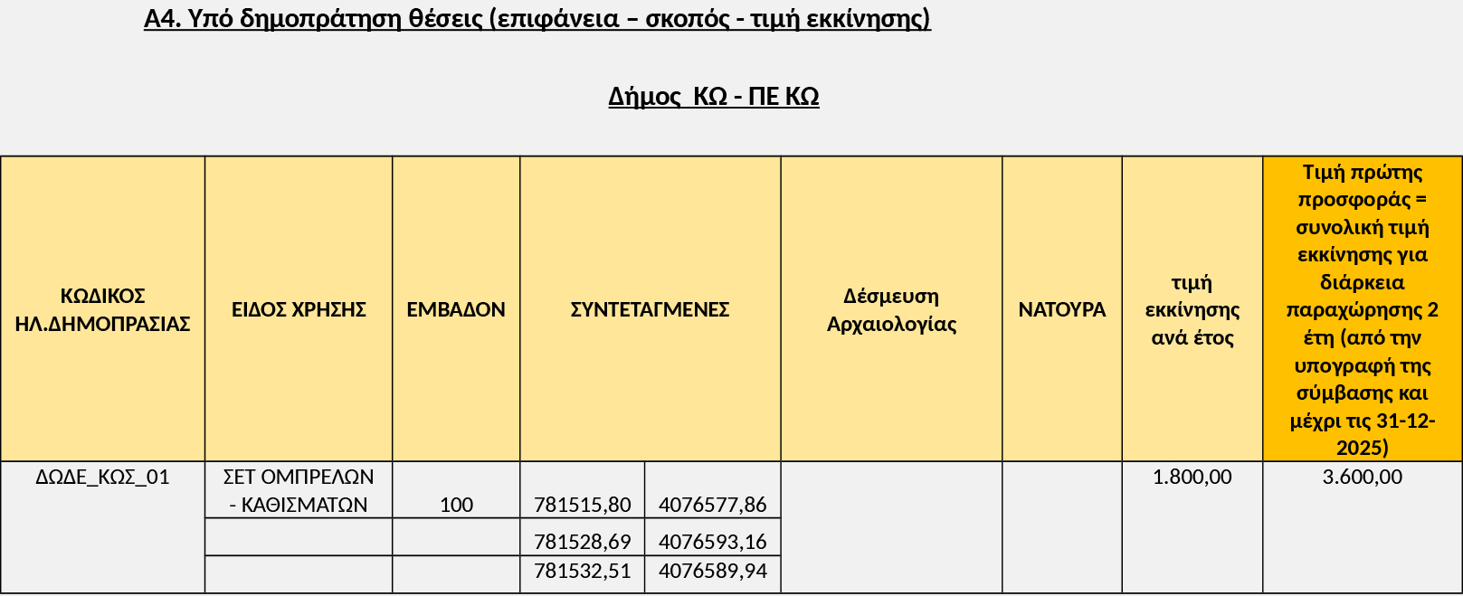 Με τους όρους και τις υποχρεώσεις της από 10-05-2024 αρχικής Διακήρυξης Πλειοδοτικής Δημοπρασίας (με ΑΔΑ: 65Θ8Η-9ΓΠ) του Προϊσταμένου της Κτηματικής Υπηρεσίας ΔΩΔΕΚΑΝΗΣΩΝ Α’ επαναλαμβάνεται η δημοπρασία στις ημερομηνίες και ώρες που αναφέρονται στους παρακάτω πίνακες, για την παραχώρηση του δικαιώματος απλής χρήσης αιγιαλού, στις παρακάτω θέσεις ανά Δήμο: