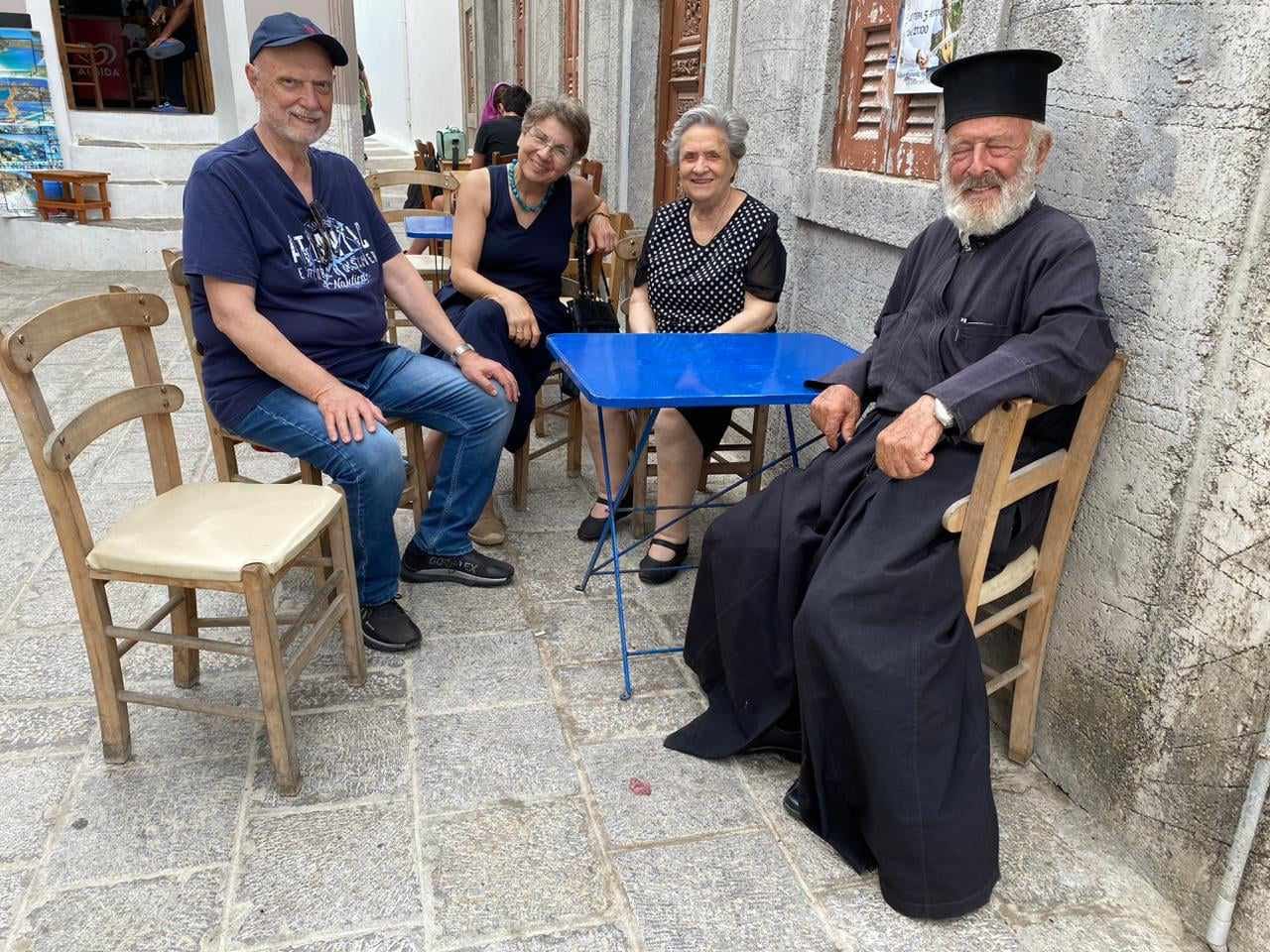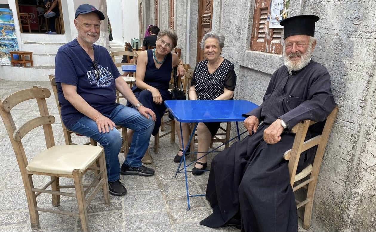 Είχε συναντήσεις μικρής διάρκειας με τον κ. Ιωάννη Πρεάρη, τον μοναδικό κατασκευαστή παραδοσιακών υποδημάτων του χωριού, και τον παπα-Γιάννη Διακογεωργίου, με τον οποίο συζήτησε για την ιστορία της Ολύμπου και την αρχιτεκτονική του ναού της Κοιμήσεως της Θεοτόκου.