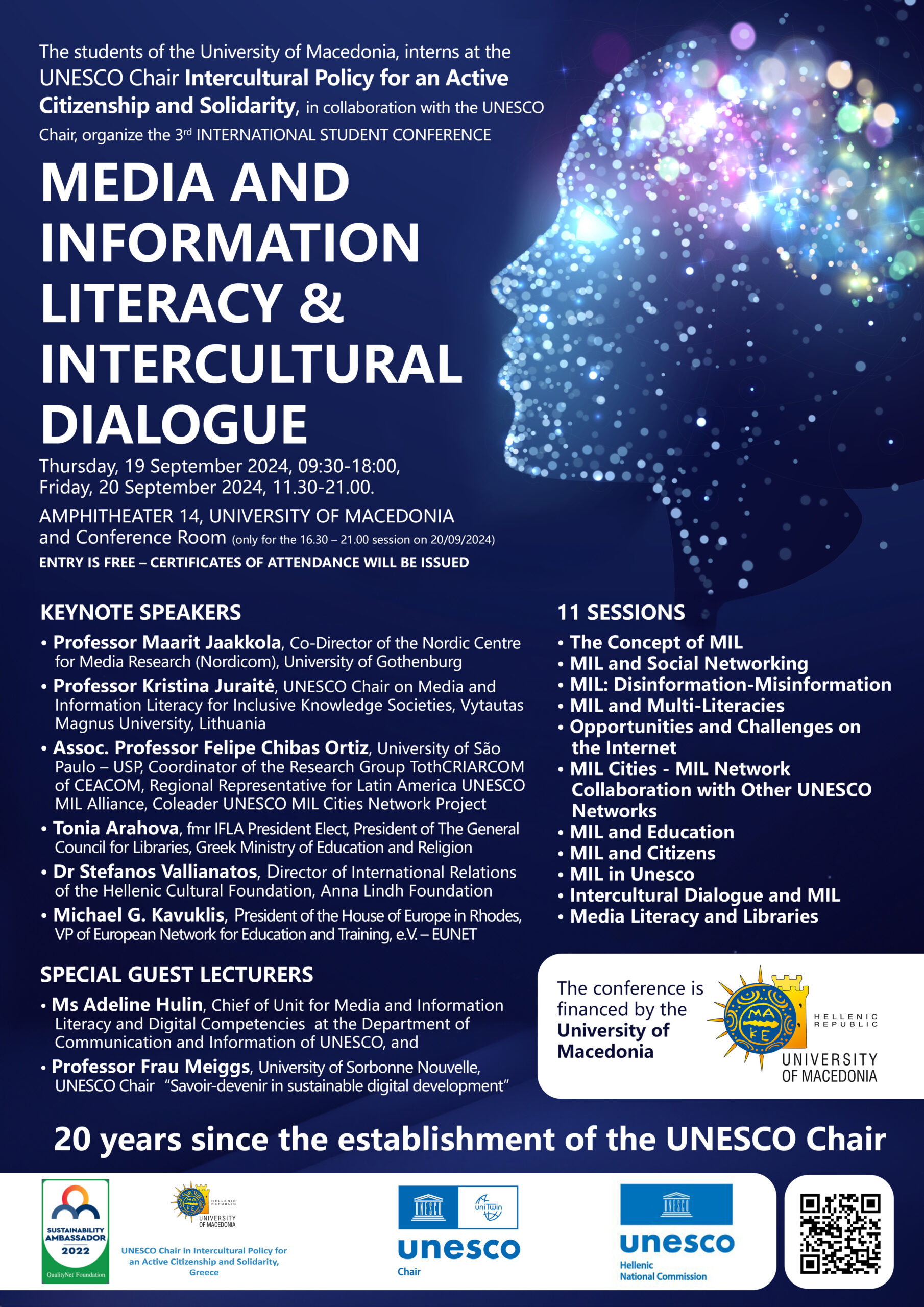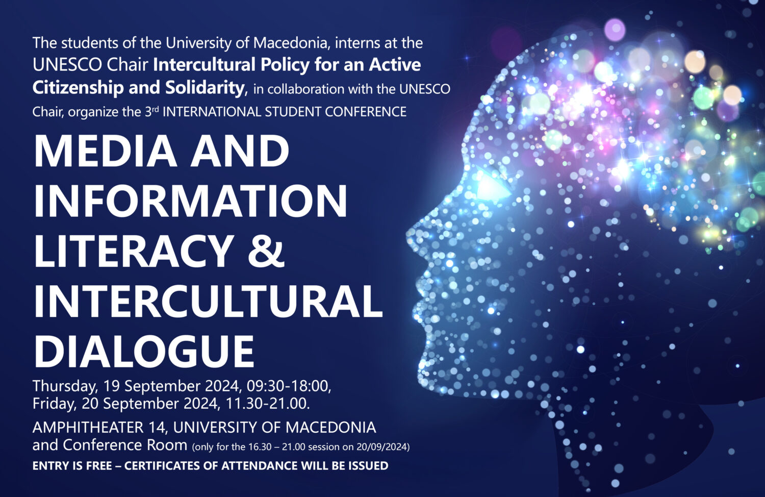 Το 3ο διήμερο Διεθνές Φοιτητικό Συνέδριο φέρει τον τίτλο: «ΕΓΓΡΑΜΜΑΤΙΣΜΟΣ ΣΤΑ ΜΕΣΑ ΕΝΗΜΕΡΩΣΗΣ ΚΑΙ ΣΤΗΝ ΠΛΗΡΟΦΟΡΗΣΗ & ΔΙΑΠΟΛΙΤΙΣΜΙΚΟΣ ΔΙΑΛΟΓΟΣ», τελεί υπό την αιγίδα της Ελληνικής Εθνικής Επιτροπής για την UNESCO και διεξάγεται δια ζώσης χάρη στην χορηγία του Πανεπιστημίου Μακεδονίας που στοχεύει στην ανάπτυξη νέων δεξιοτήτων και εμβάθυνση της γνώσης των φοιτητών.