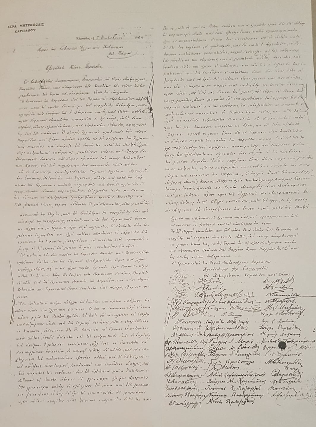 Φέρει δε τις υπογραφές των μελών της επιτροπής του αγώνα από όλα τα χωριά της Καρπάθου ακόμα και από την γειτονική Κάσο σύνολο υπογραφών 52.