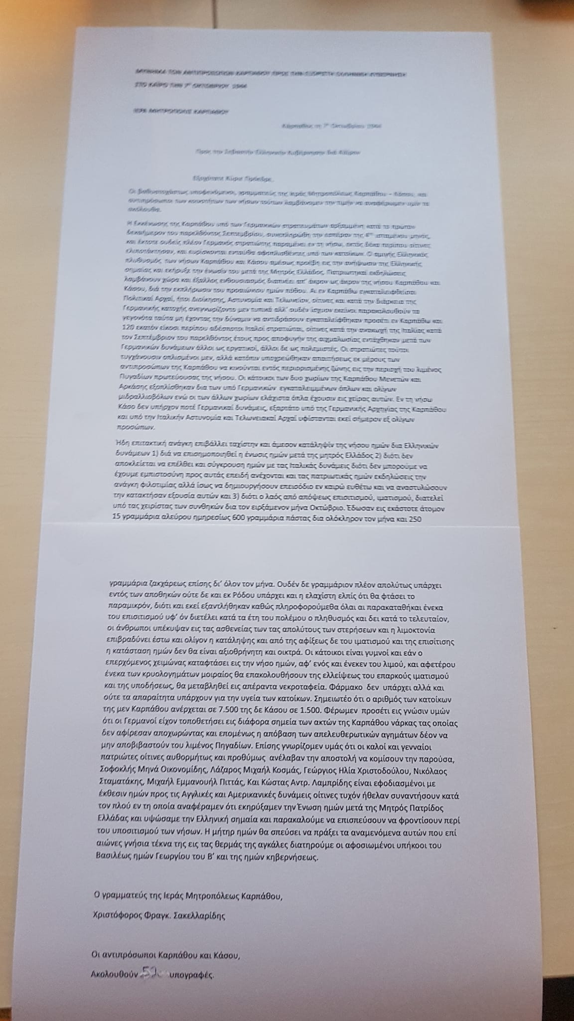 Αυτό είναι το αυθεντικό χειρόγραφο έγγραφο – αίτημα των Καρπαθίων προς το Συμμαχικό Στρατηγείο και στην τότε εξόριστη ελληνική κυβέρνηση που μετέφεραν με το μικρό σκάφος ” ΙΜΜΑΚΟΛΑΤΑ” οι εφτά θαρραλέοι άντρες από την Κάρπαθο.