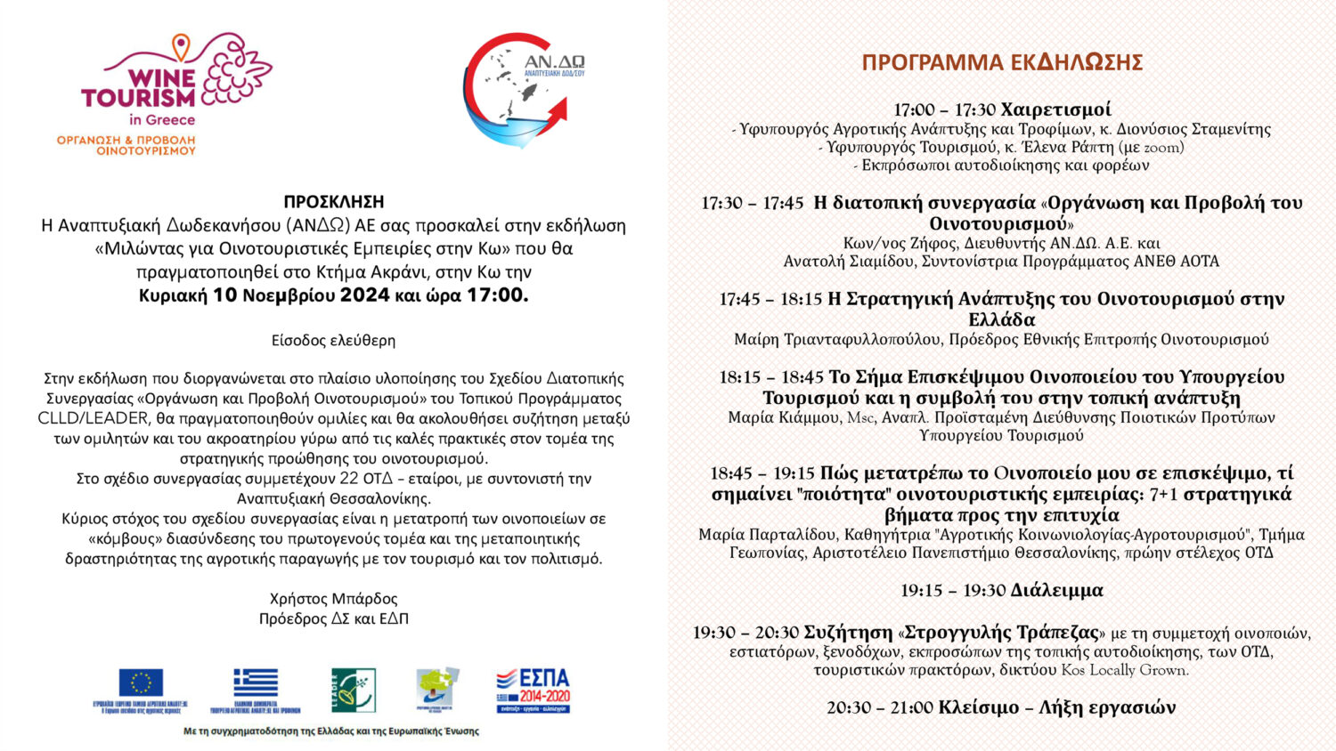 Η Αναπτυξιακή Δωδεκανήσου (ΑΝΔΩ) ΑΕ σας προσκαλεί στην εκδήλωση «Μιλώντας για Οινοτουριστικές Εμπειρίες στην Κω» που θα πραγματοποιηθεί στο Κτήμα Ακράνι, στην Κω την Κυριακή 10 Νοεμβρίου 2024 και ώρα 17:00.
