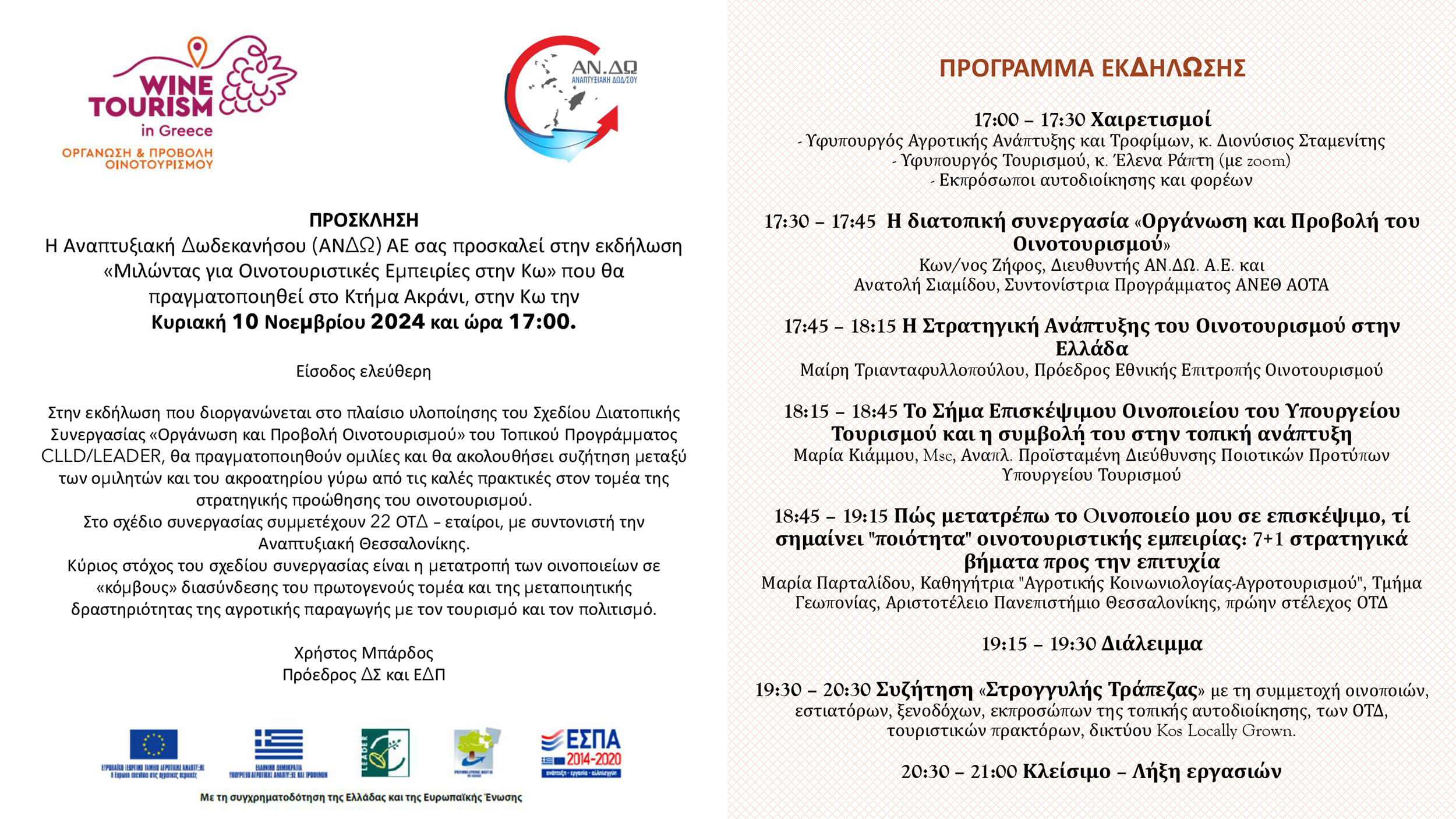 Συνεργασίας «Οργάνωση και Προβολή Οινοτουρισμού» του Τοπικού Προγράμματος CLLD/LEADER, θα πραγματοποιηθούν ομιλίες και θα ακολουθήσει συζήτηση μεταξύ των ομιλητών και του ακροατηρίου γύρω από τις καλές πρακτικές στον τομέα της στρατηγικής προώθησης του οινοτουρισμού.