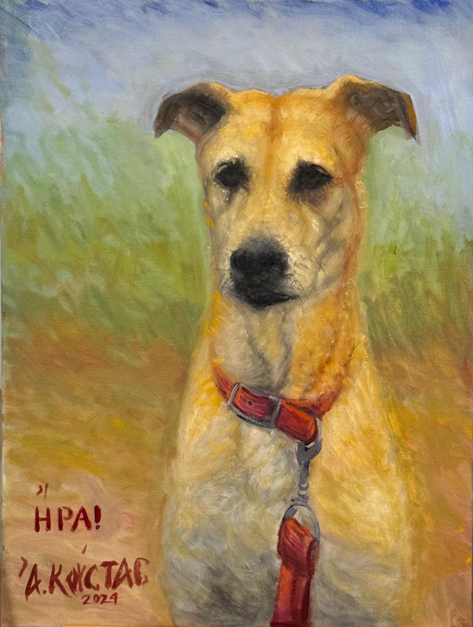 Ο Ανδρέας Κούστας προσφέρει για τη λαχειοφόρο της ΦΔΚ το έργο του με τίτλο “Ήρα”, που έφτιαξε ειδικά για την περίσταση. Είναι το πορτρέτο του σκύλου του, της Ήρας. Ακρυλικά χρώματα σε κόντρα πλακέ, διαστάσεις: 30 x 40 cm.