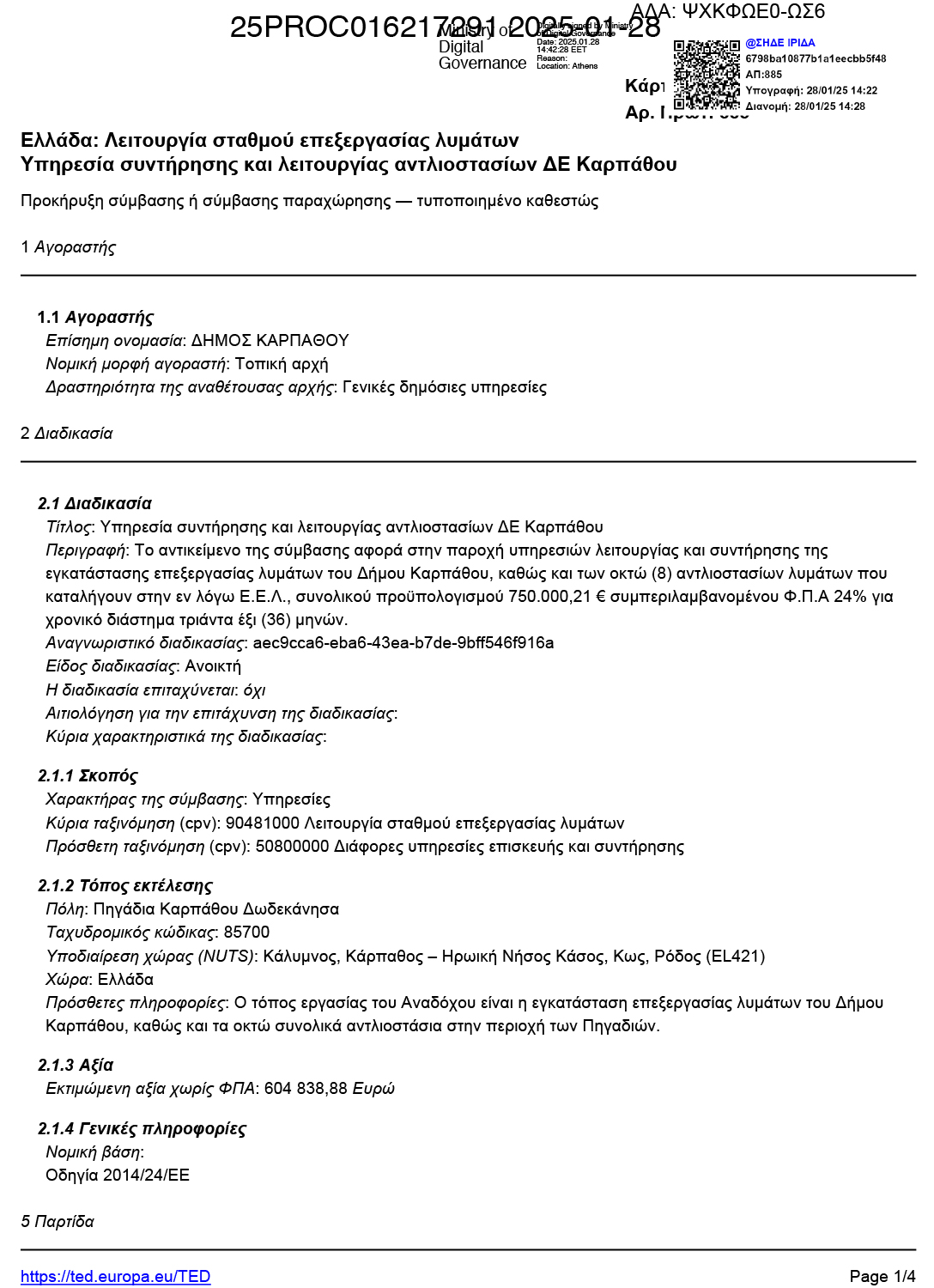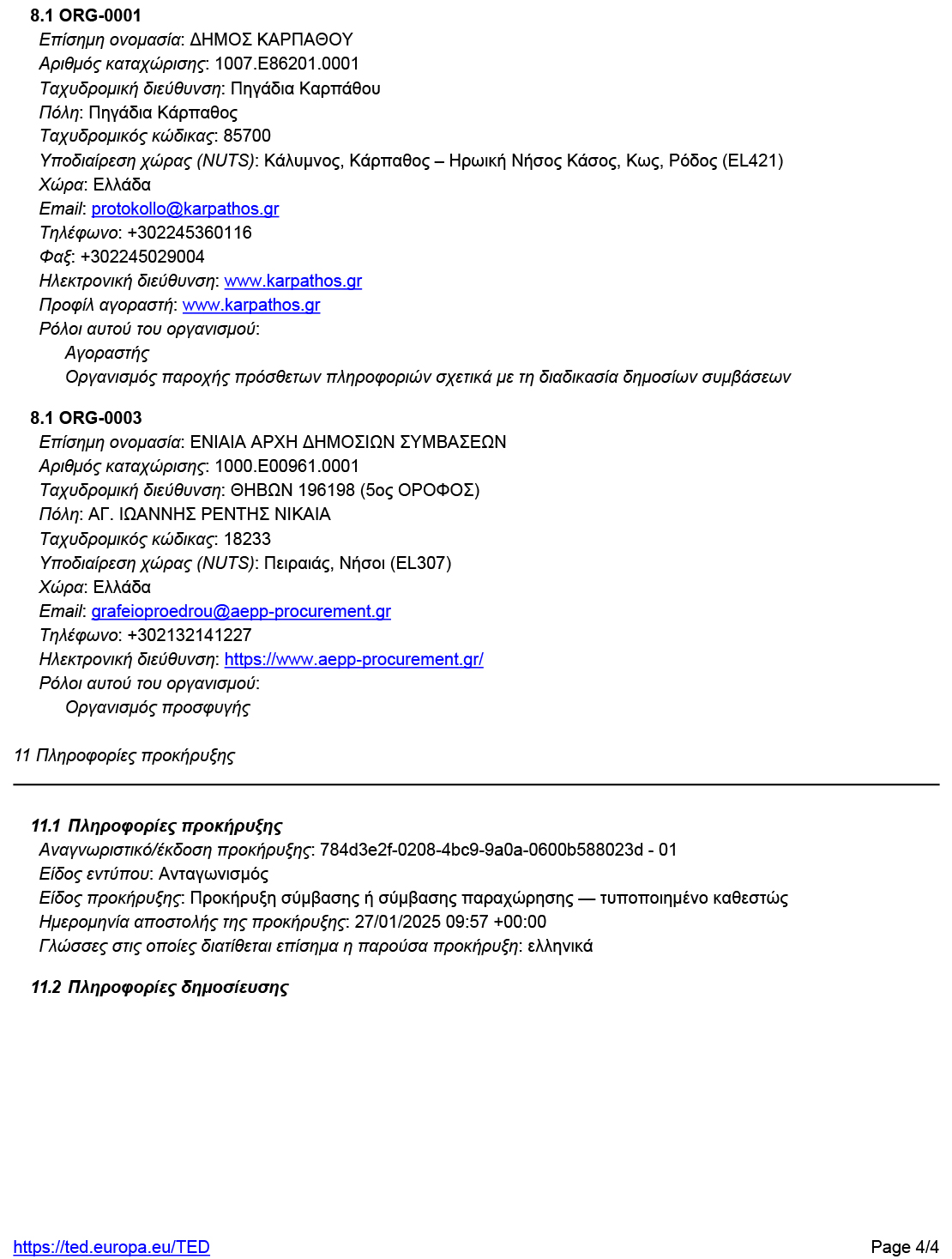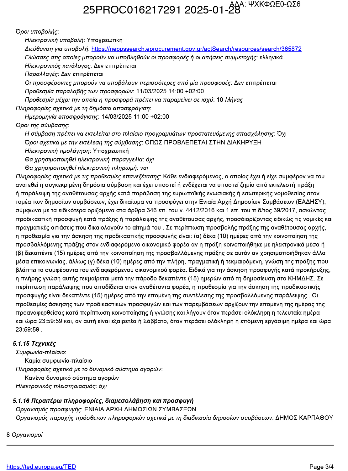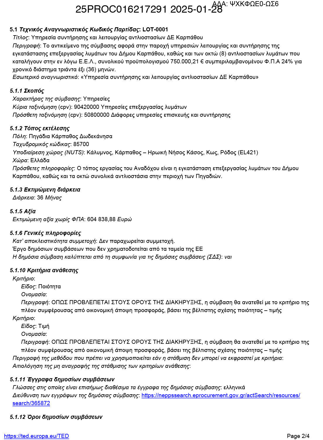 Διακήρυξη ανοιχτού ηλεκτρονικού διαγωνισμού για την παροχή υπηρεσιών: Υπηρεσία συντήρησης και λειτουργίας αντλιοστασίων ΔΕ Καρπάθου
