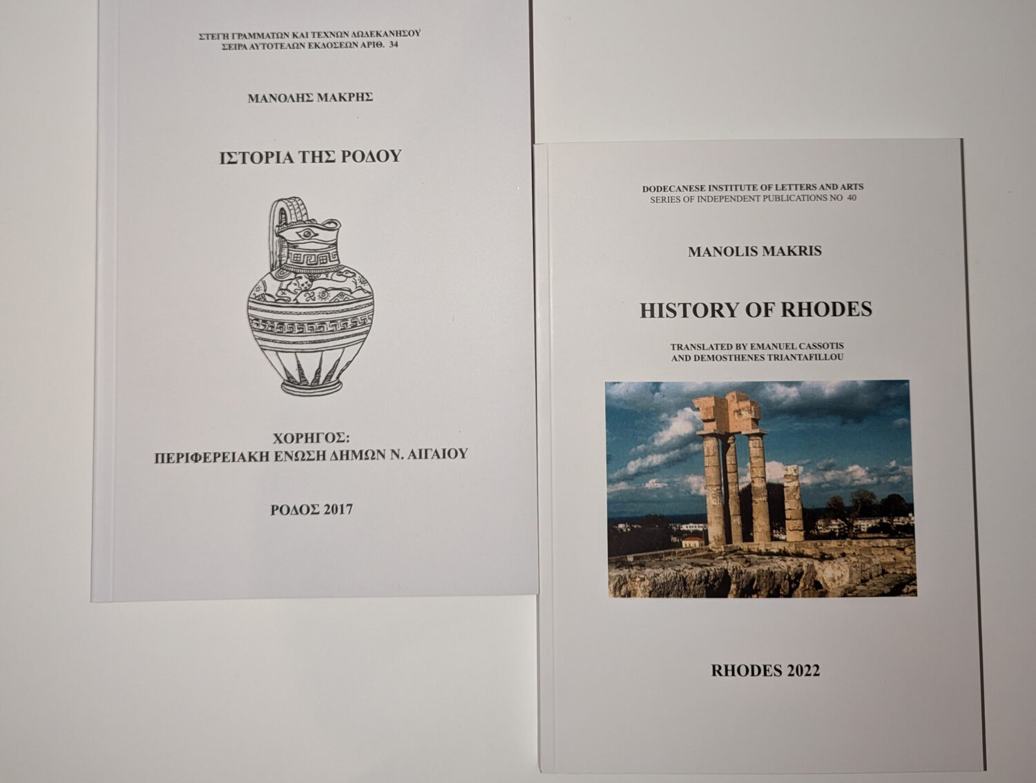 Το βιβλίο _Η Ιστορία της Ρόδου_, γραμμένο στα ελληνικά από τον Μανόλη Μακρή και εκδόθηκε σε συνεργασία και με την υποστήριξη της Στέγης Γραμμάτων και Τεχνών Δωδεκανήσου, μεταφράστηκε στα αγγλικά από τους Εμμανουήλ Κασσώτη και Δημοσθένη Τριανταφύλλου. Μέσα από τις σελίδες του, αναδεικνύεται η πολυδιάστατη ιστορία της Ρόδου, από την αρχαιότητα έως τη σύγχρονη εποχή, αναδεικνύοντας τη στρατηγική, πολιτιστική και ιστορική της σημασία.