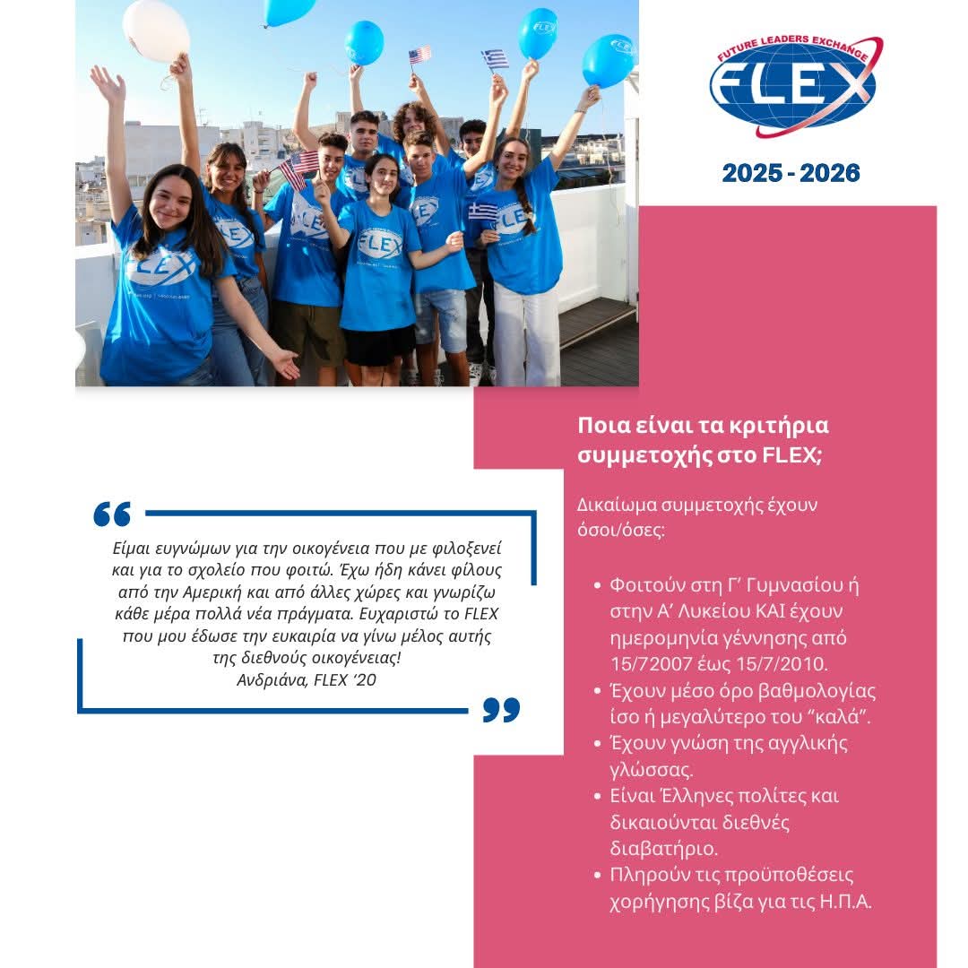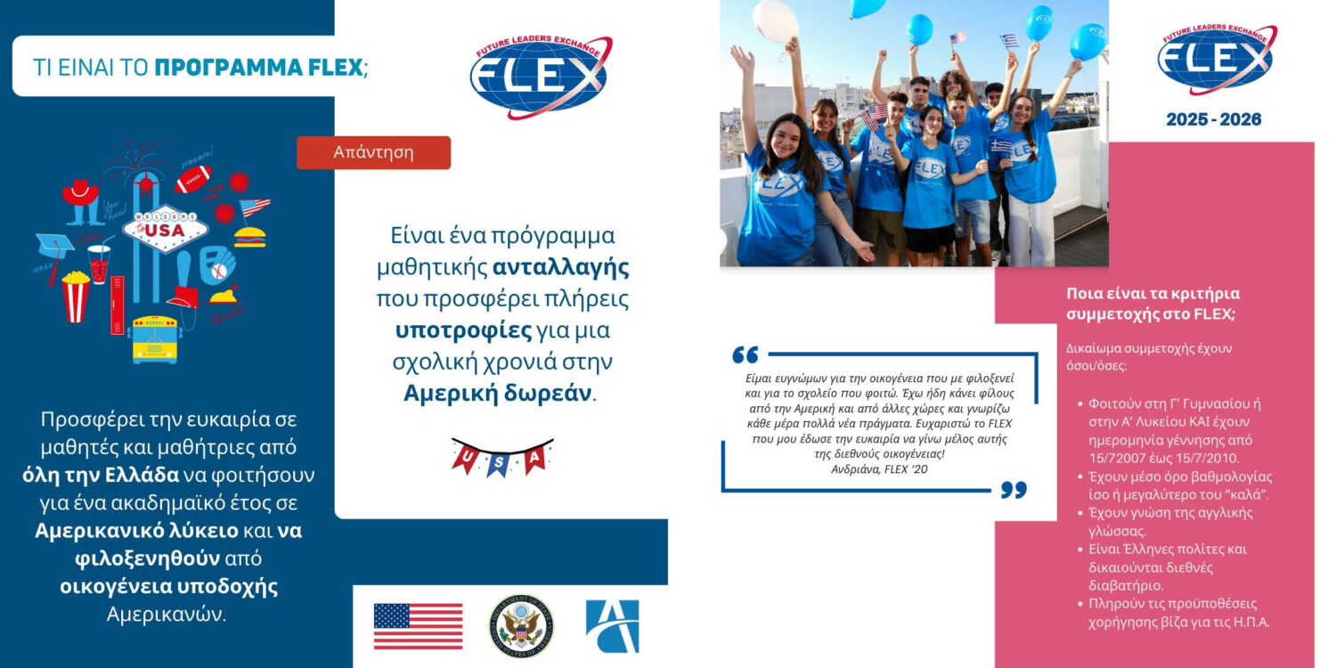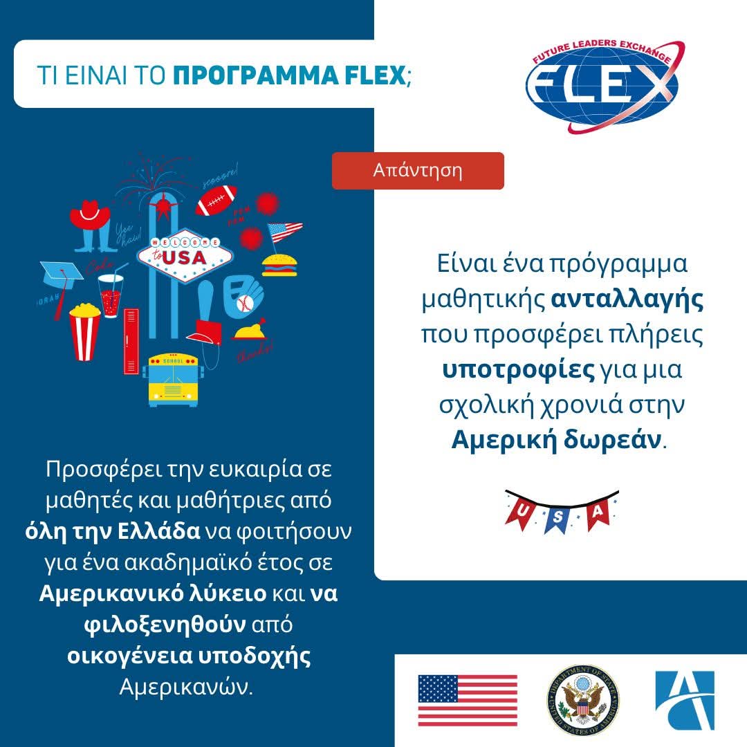 Το FLEX είναι ένα πρόγραμμα πολιτισμικής ανταλλαγής που προσφέρει υποτροφίες σε επιλεγμένους/ες μέσω διαγωνισμού μαθητές/τριες για να περάσουν ένα ακαδημαϊκό έτος στις Η.Π.Α., ζώντας με μια οικογένεια υποδοχής και φοιτώντας σε Αμερικανικό σχολείο.