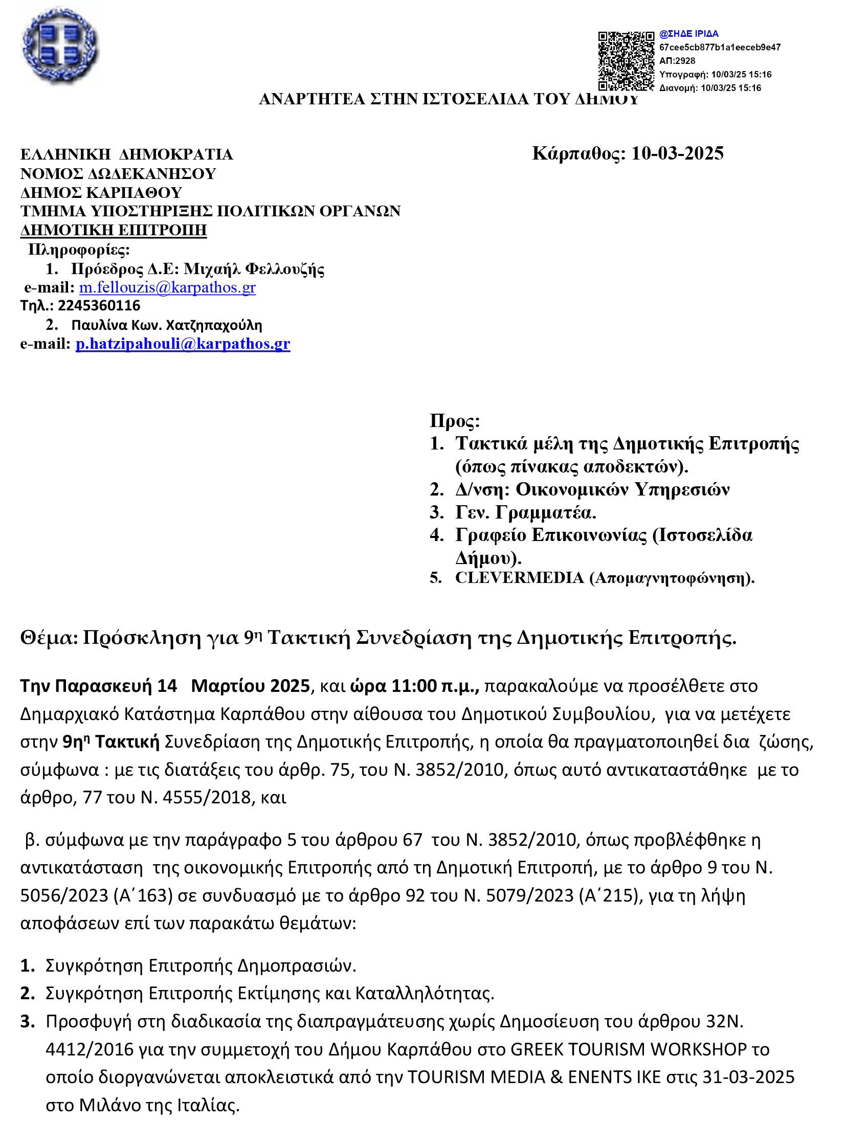 Την Παρασκευή 14 Μαρτίου 2025, και ώρα 11:00 π.μ., παρακαλούμε να προσέλθετε στο Δημαρχιακό Κατάστημα Καρπάθου στην αίθουσα του Δημοτικού Συμβουλίου, για να μετέχετε στην 9ηη Τακτική Συνεδρίαση της Δημοτικής Επιτροπής, η οποία θα πραγματοποιηθεί δια ζώσης…