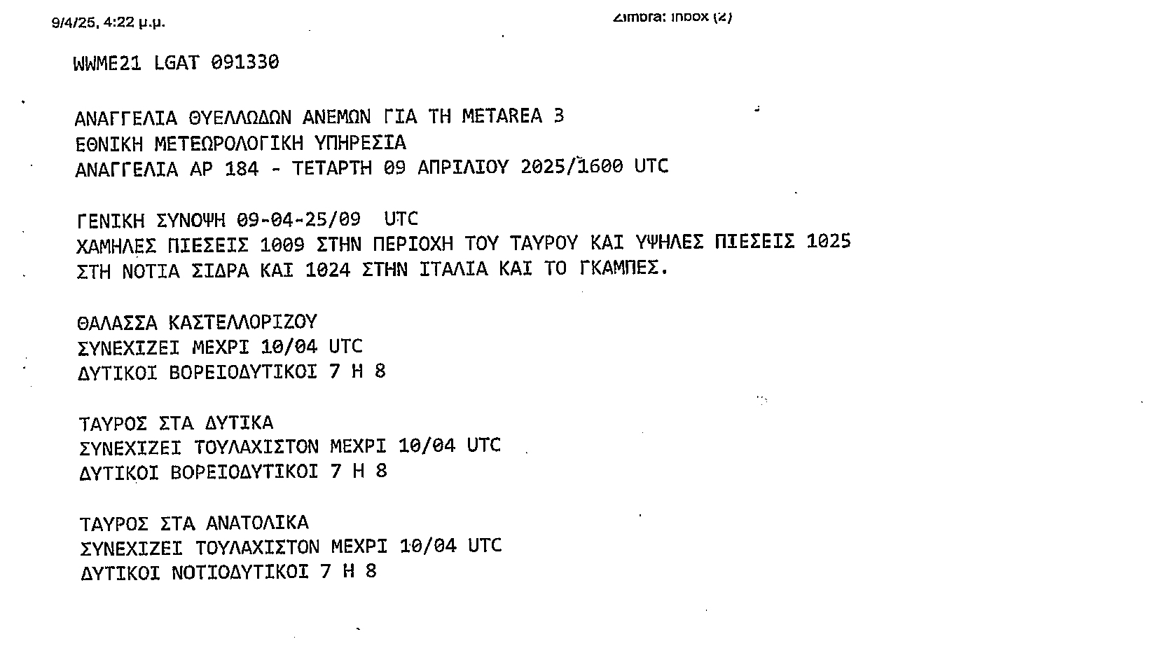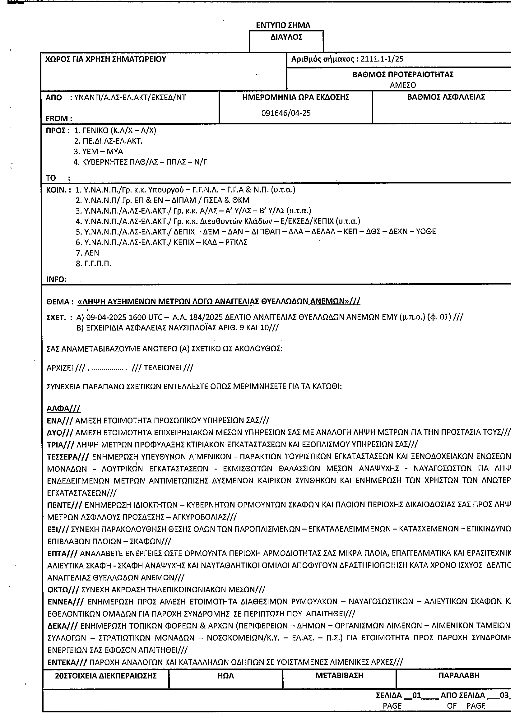 Λήψη Αυξημένων Μέτρων Λόγω Αναγγελίας Θυελλωδών Ανέμων 10/4/2025