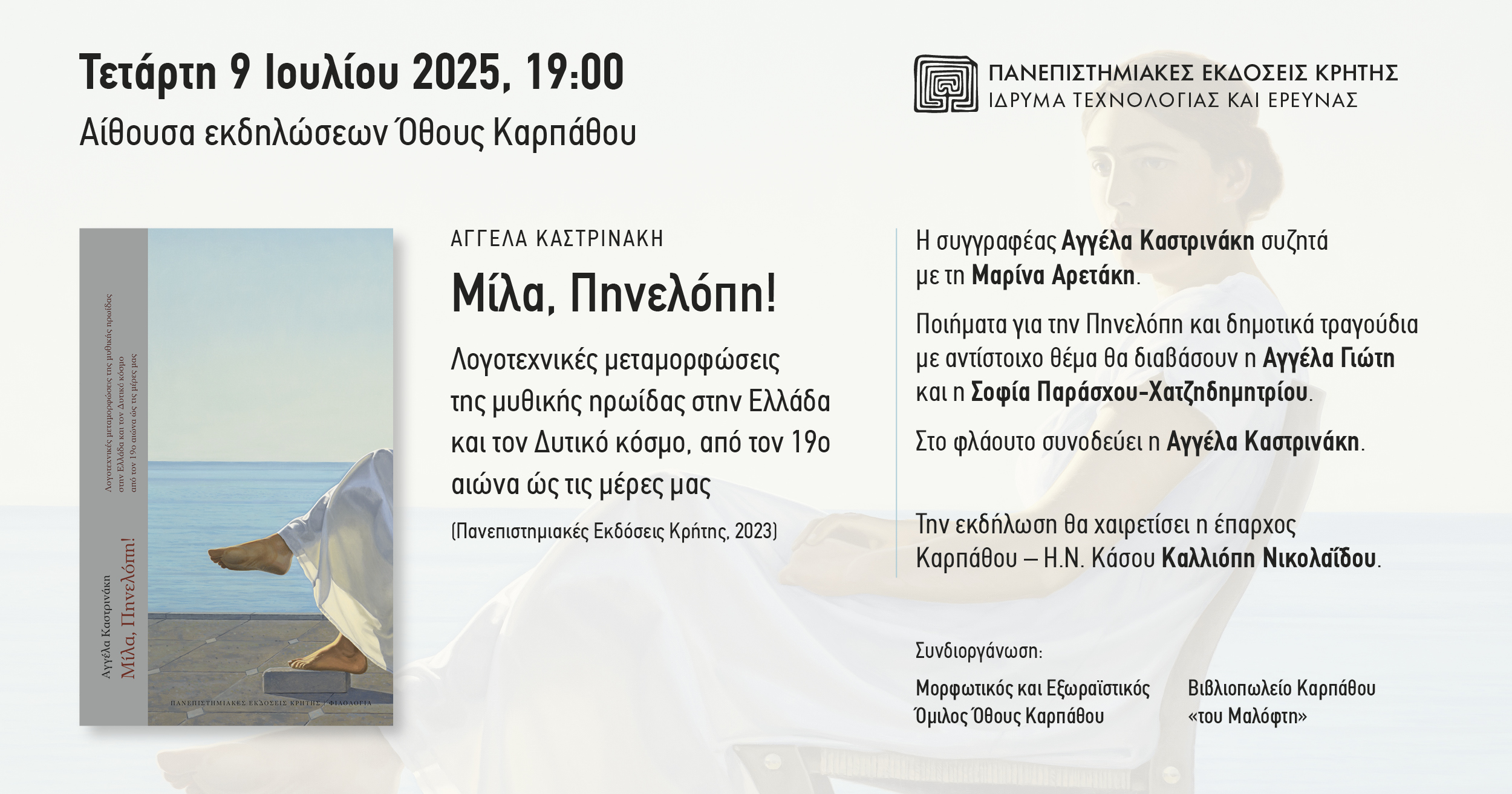 Η συγγραφέας θα συζητήσει για το βιβλίο της με τη Μαρίνα Αρετάκη, μέλος Ε.ΔΙ.Π. του Τμήματος Φιλολογίας του Πανεπιστημίου Κρήτης. Στο τέλος η Αγγέλα Γιώτη και η Σοφία Παράσχου-Χατζηδημητρίου θα διαβάσουν ποιήματα για την Πηνελόπη και δημοτικά τραγούδια με αντίστοιχο θέμα, συνοδευόμενες από την Αγγέλα Καστρινάκη στο φλάουτο.