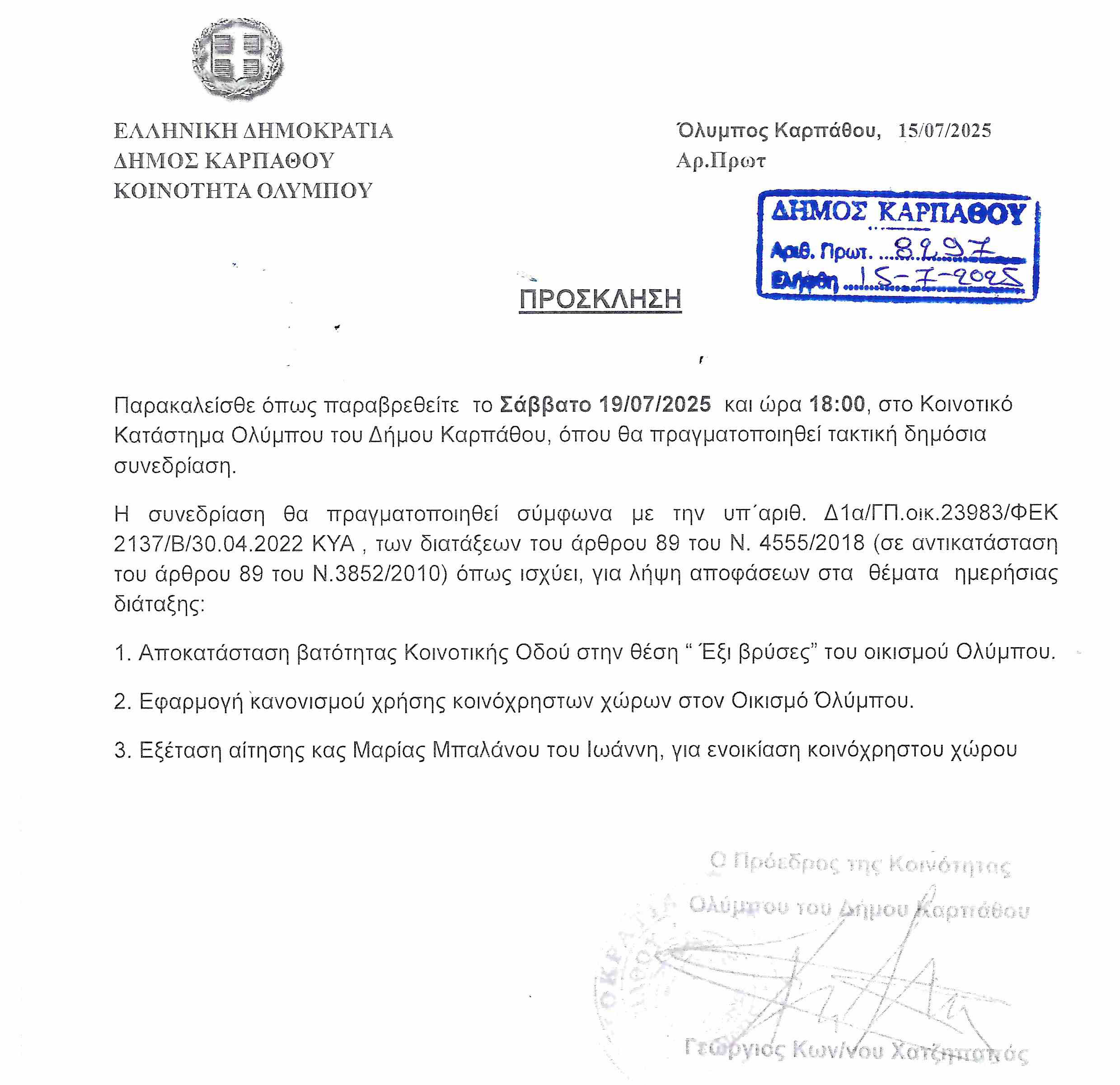 Πρόσκληση για Τακτική Συνεδρίαση της Κοινότητας Ολύμπου_Σάββατο 19/7/2025, 18:00μμ