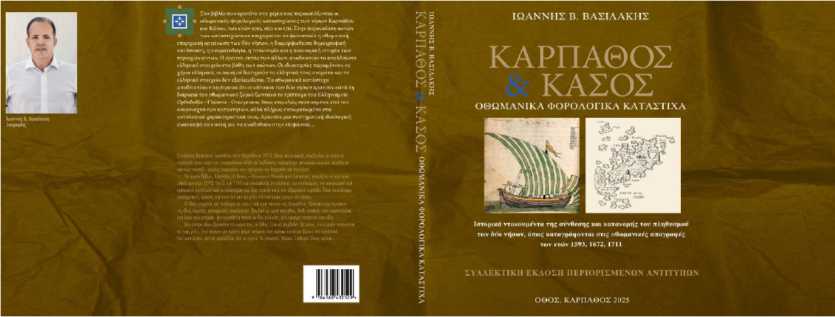 Στη διάθεση του αναγνωστικού κοινού βρίσκεται το βιβλίο του Ιωάννη Β. Βασιλάκη «Κάρπαθος & Κάσος – Οθωμανικά Φορολογικά Κατάστιχα», το οποίο αξιοποιεί για πρώτη φορά ανέκδοτα οθωμανικά κατάστιχα των ετών 1593, 1672 και 1711, φωτίζοντας πτυχές της ιστορικής διαδρομής των δύο νησιών.
