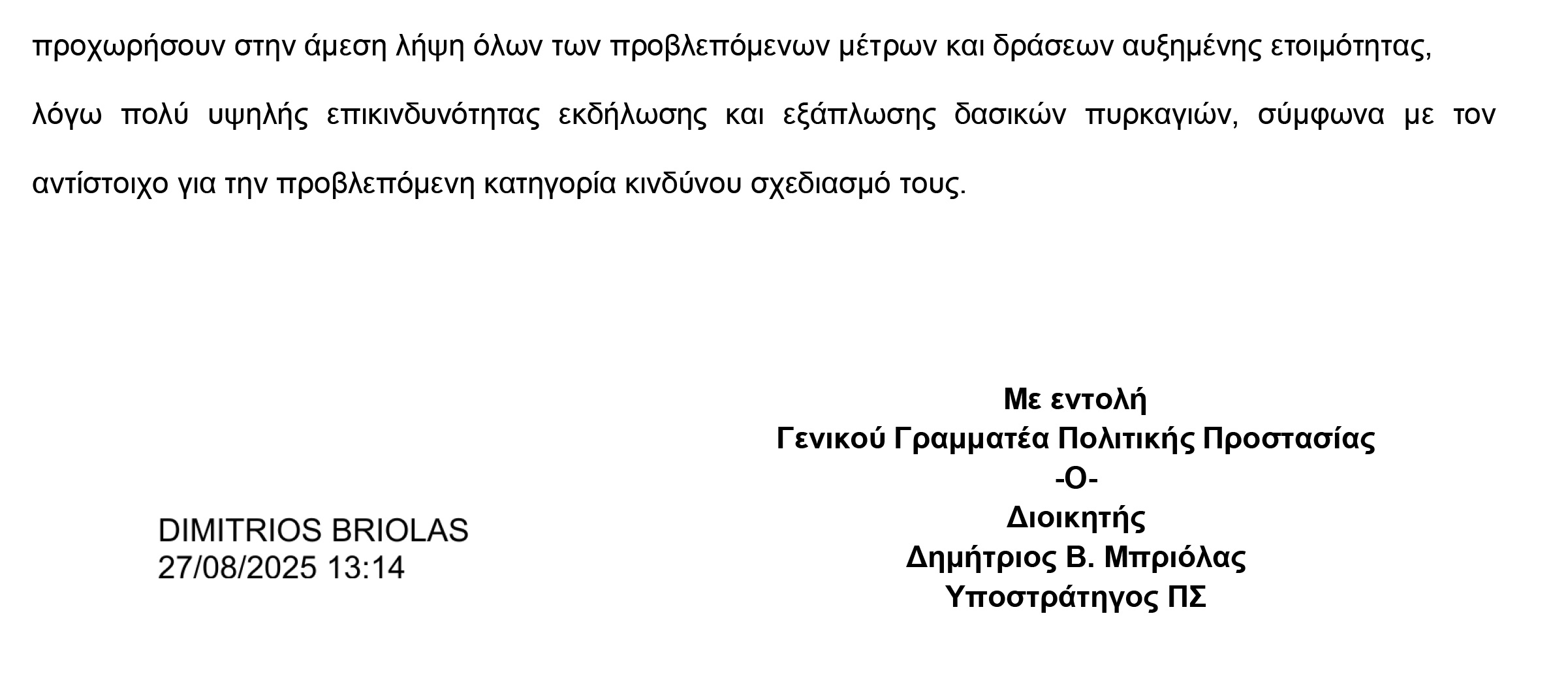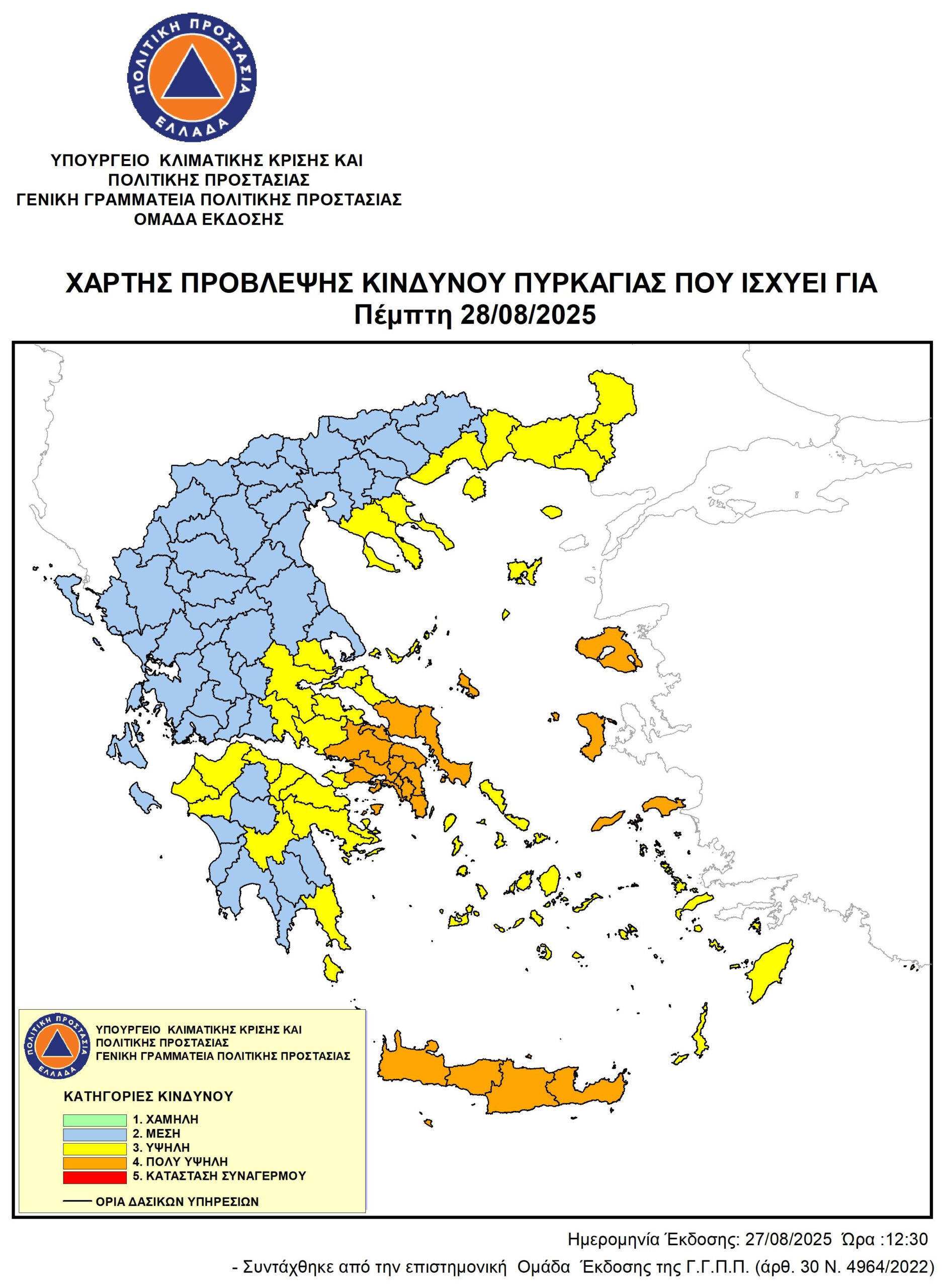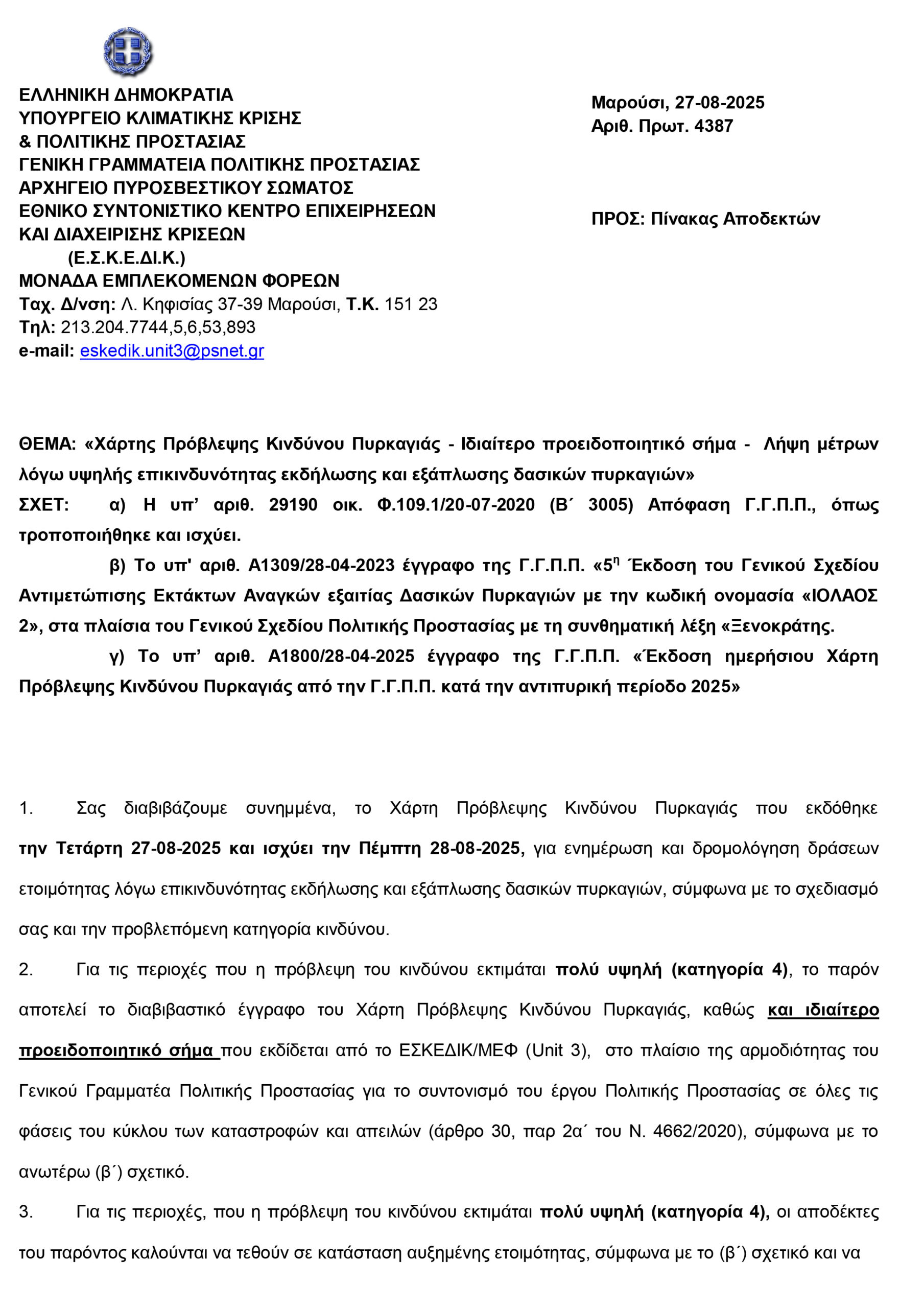 Χάρτης Πρόβλεψης Κινδύνου Πυρκαγιάς – Ιδιαίτερο προειδοποιητικό σήμα – Λήψη μέτρων λόγω υψηλής επικινδυνότητας εκδήλωσης και εξάπλωσης δασικών πυρκαγιών.