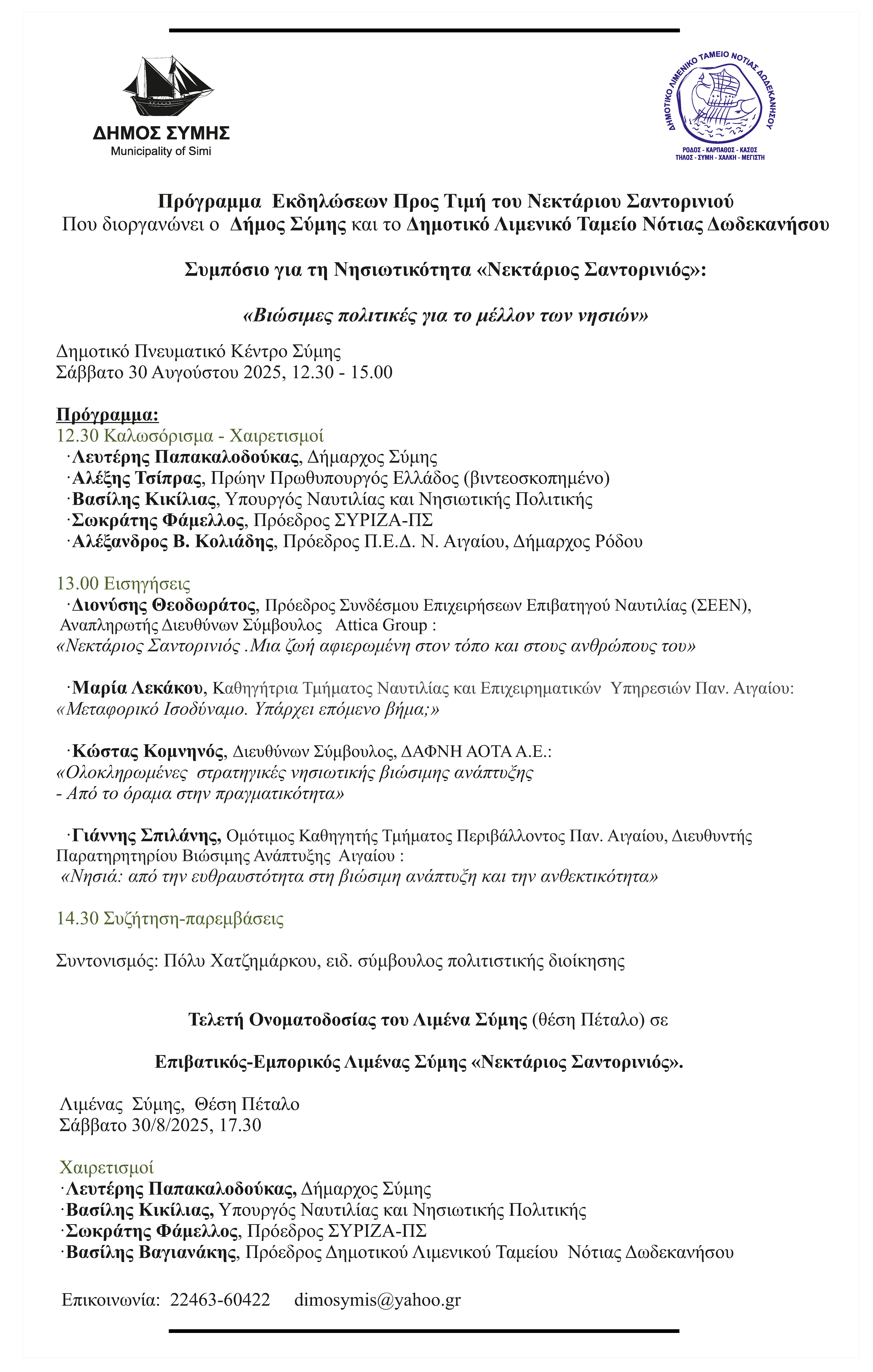 Η απόφαση για την ονοματοδοσία του Λιμένα Σύμης (θέση Πέταλο) σε Επιβατικός-Εμπορικός Λιμένας Σύμης «Νεκτάριος Σαντορινιός», από τον Δήμο Σύμης και το Δημοτικό Λιμενικό Ταμείο Νότιας Δωδεκανήσου, είναι μια έμπρακτη αναγνώριση του σημαντικού έργου του αείμνηστου συντρόφου μας, ο οποίος άφησε ισχυρό το αποτύπωμά του με τη δράση και τον αγώνα που έδωσε για την ευημερία και την πρόοδο των νησιωτών μας.