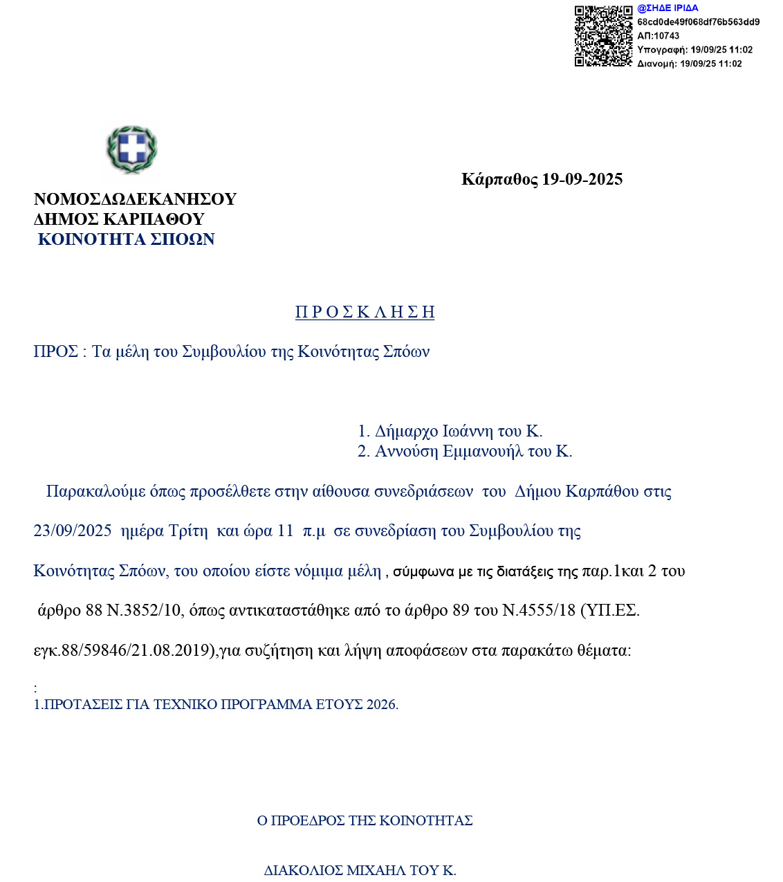 Πρόσκληση για Τακτική Συνεδρίαση της Κοινότητας Σπόων, Τρίτη, 23/9/2025, 11:00πμ