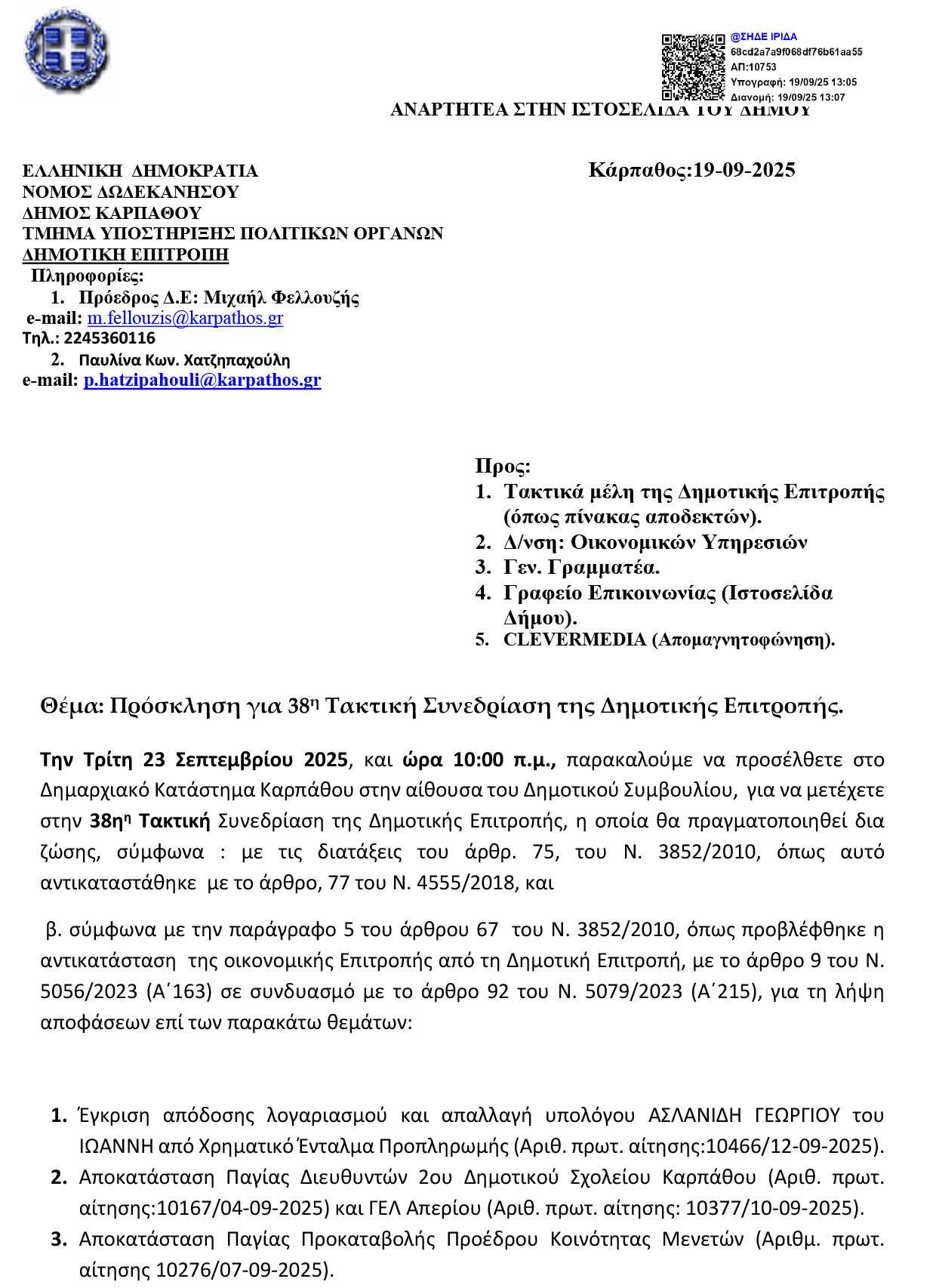 Πρόσκληση για 38η Τακτική Συνεδρίαση της Δημοτικής Επιτροπής Τρίτη, 23 Σεπτεμβρίου 2025, ώρα 10:00 π.μ.