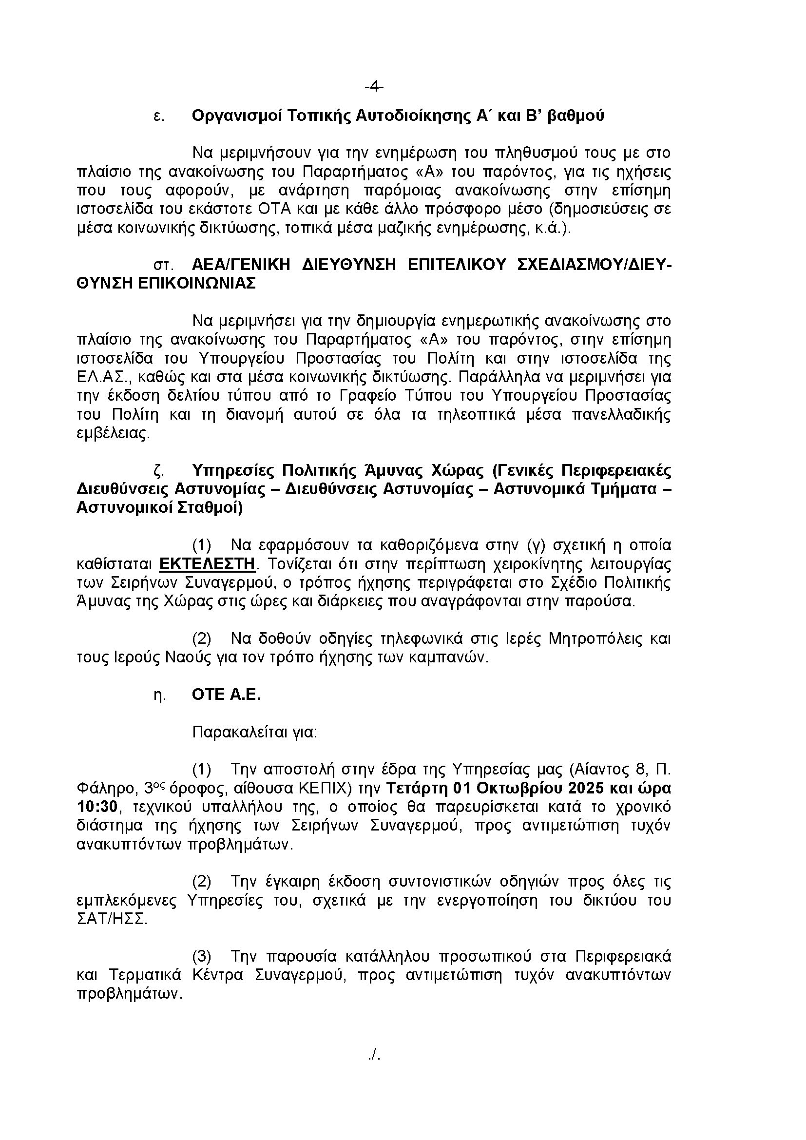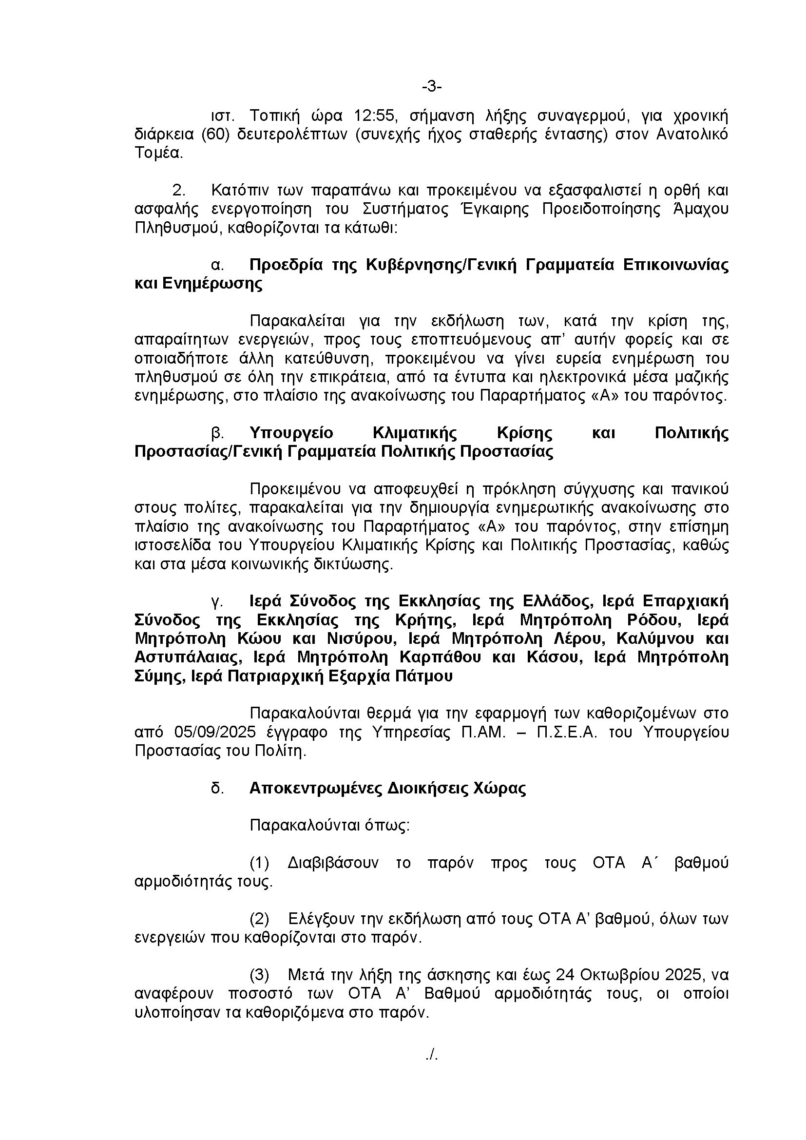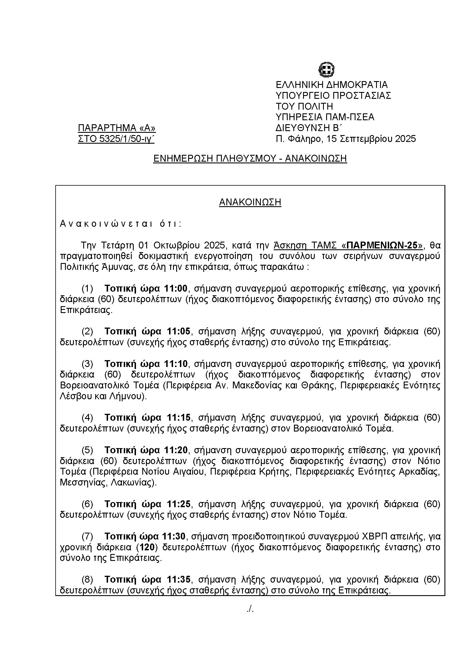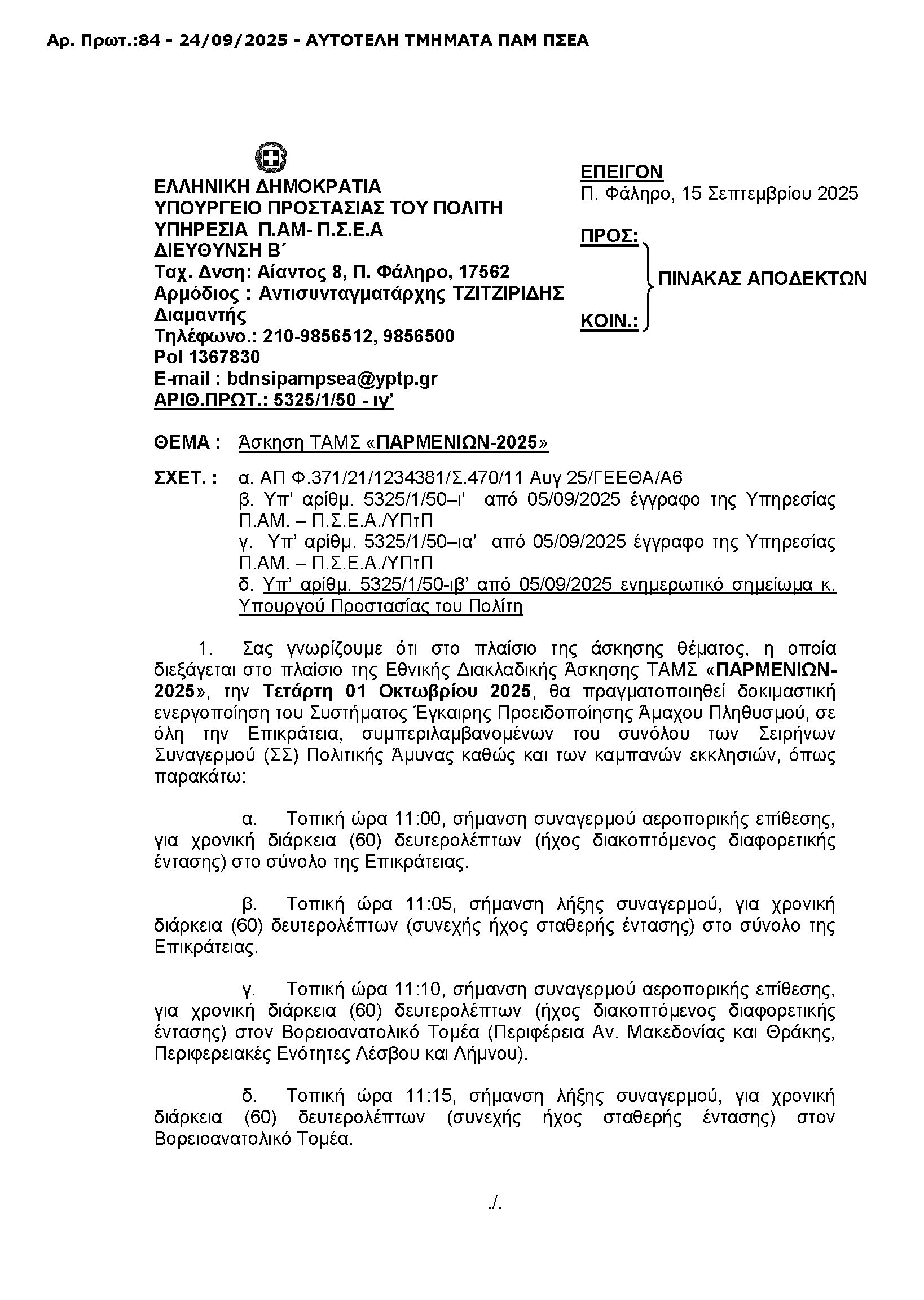 Εθνική Διακλαδική Άσκηση ΤΑΜΣ «ΠΑΡΜΕΝΙΩΝ- 2025», την Τετάρτη 01 Οκτωβρίου 2025