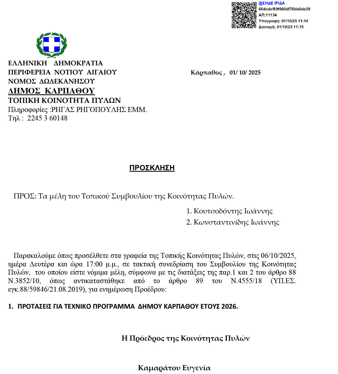 Πρόσκληση για Τακτική Συνεδρίαση της Κοινότητας Πυλών – Δευτέρα, 6/10/2025, 5:00μ.μ.