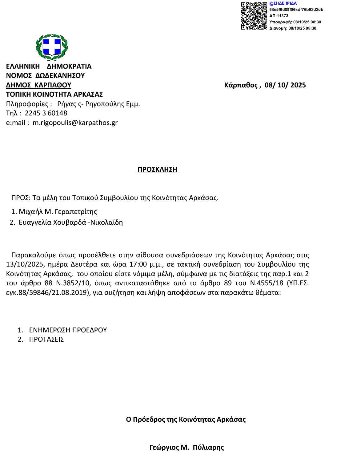 Πρόσκληση για Τακτική Συνεδρίαση της Κοινότητας Αρκάσας – Δευτέρα, 13/10/2025, 5:00μ.μ.