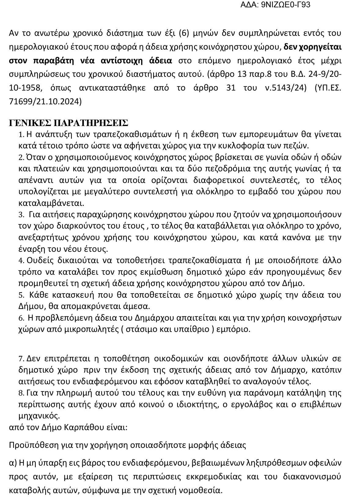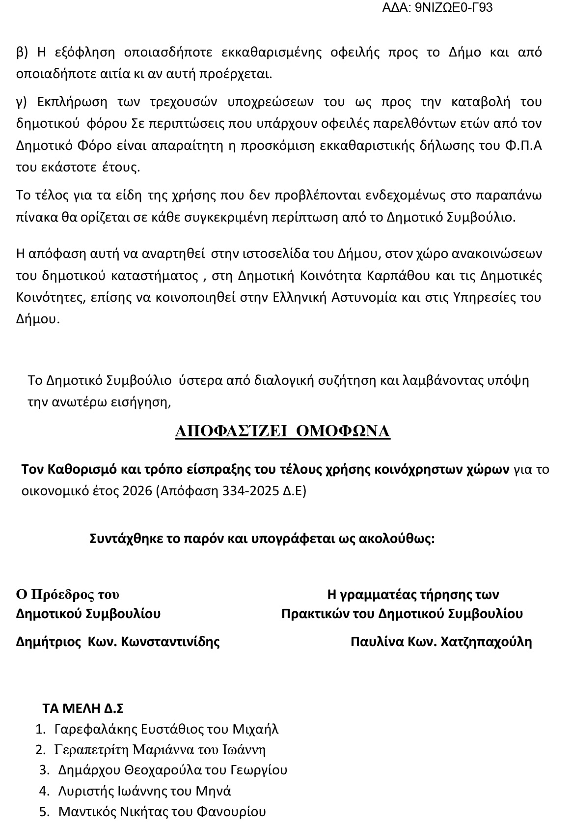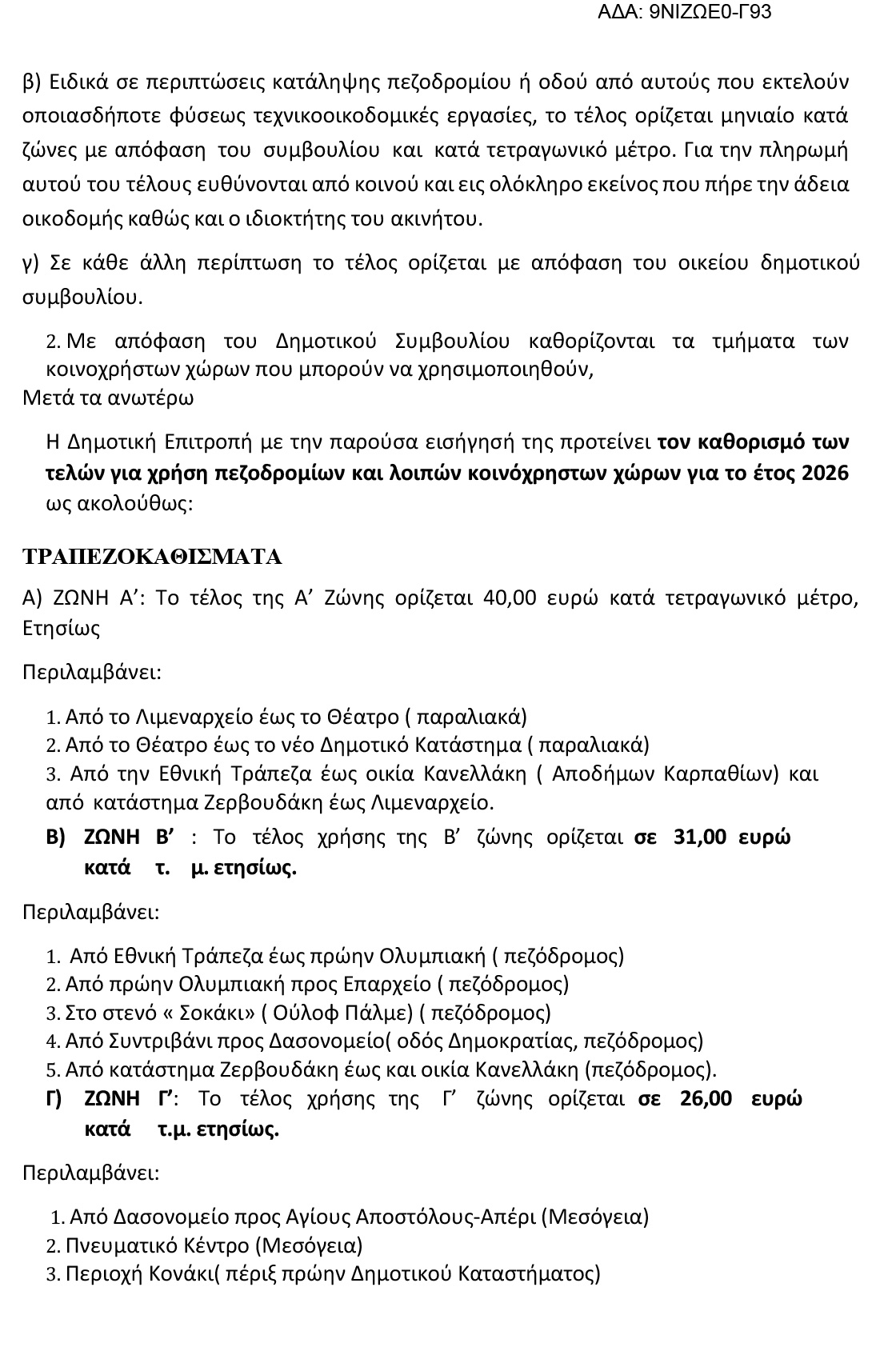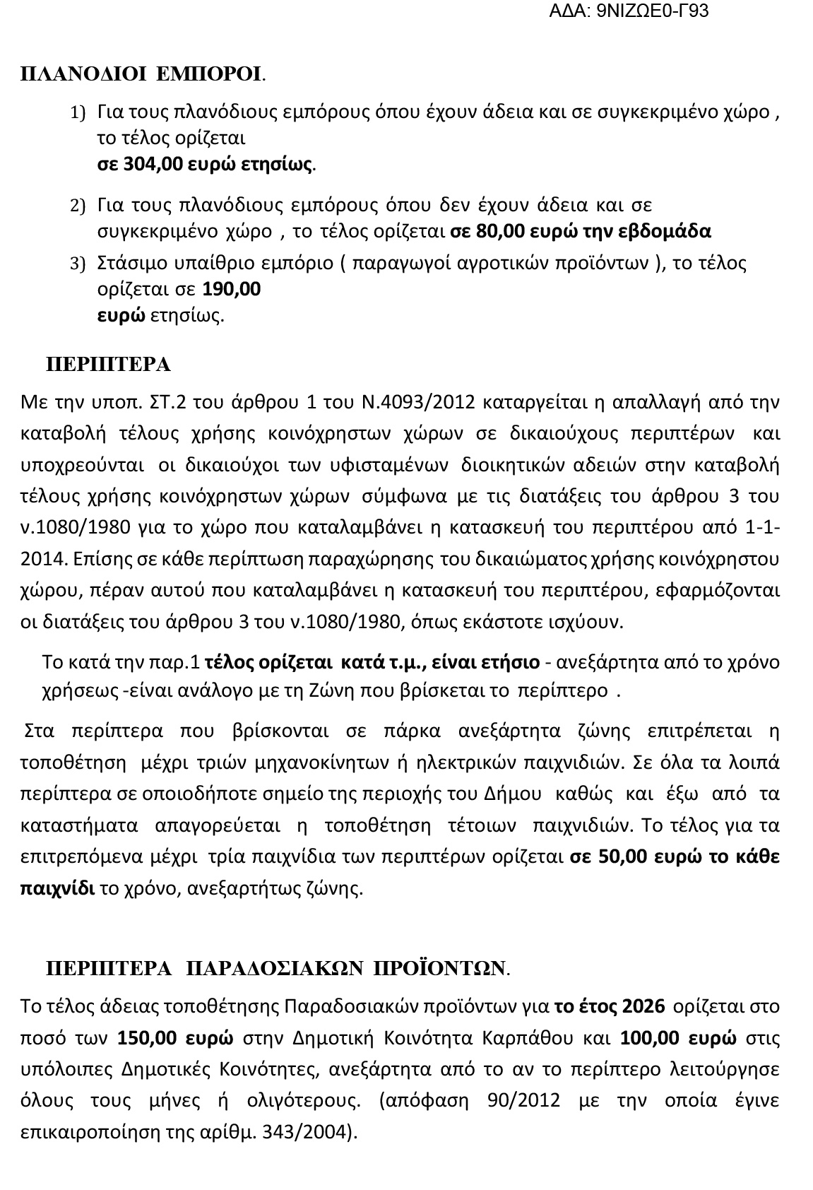 Δήμος Καρπάθου: Καθορισμός και τρόπος είσπραξης του τέλους χρήσης κοινόχρηστων χώρων για το οικονομικό έτος 2026- Απόφαση Δ.Σ. 115/2025