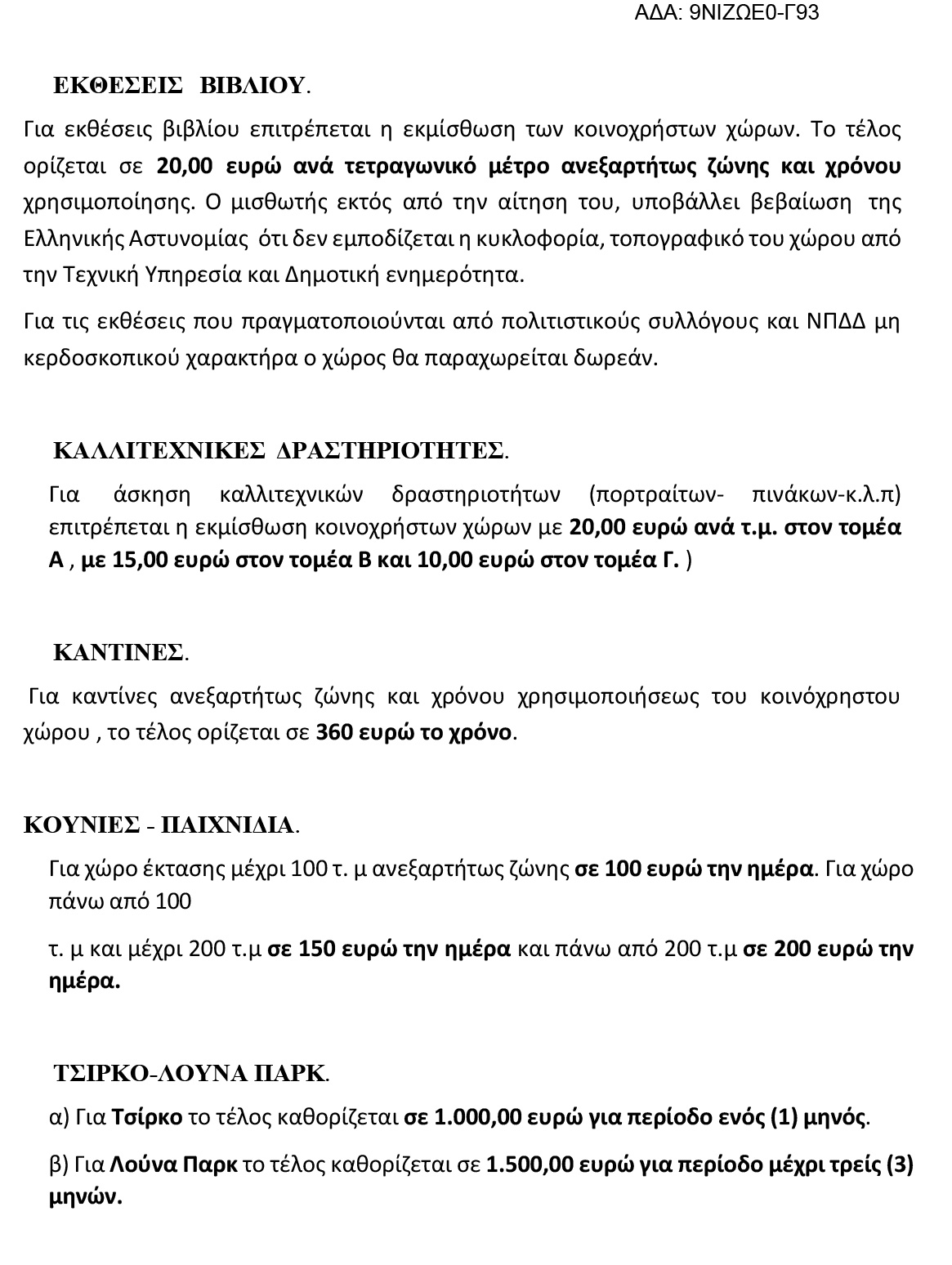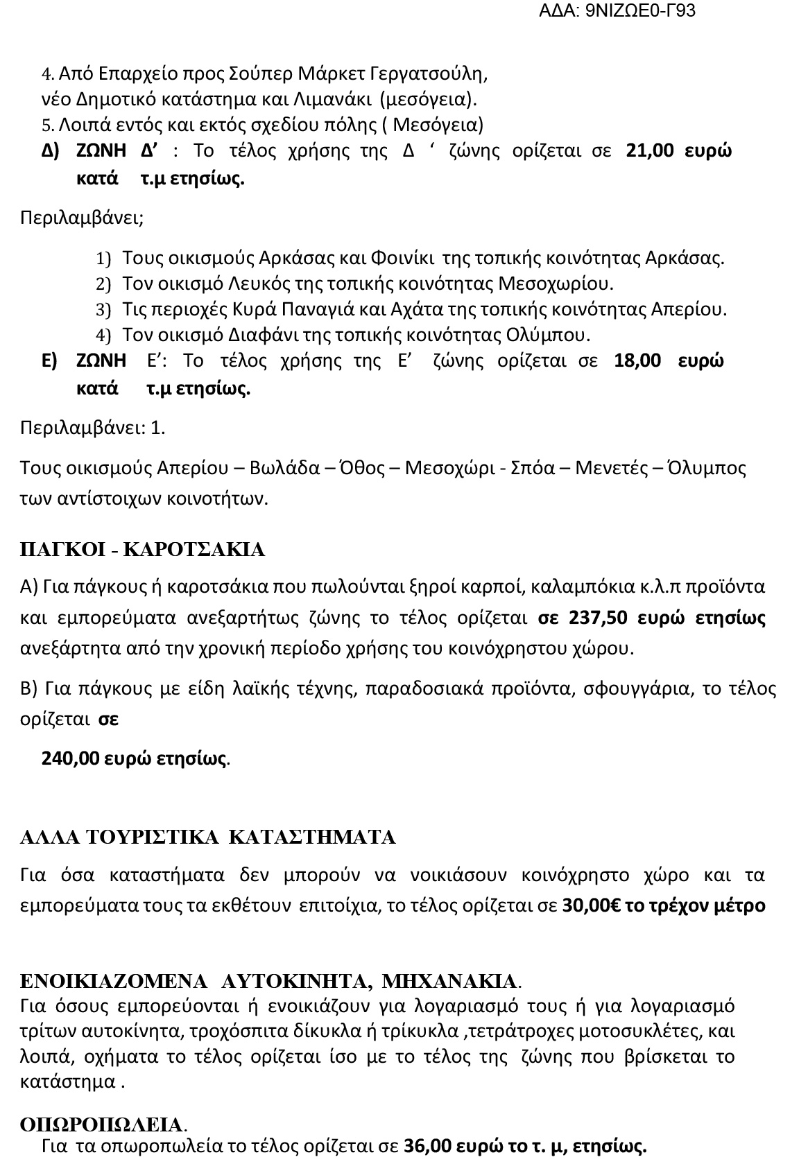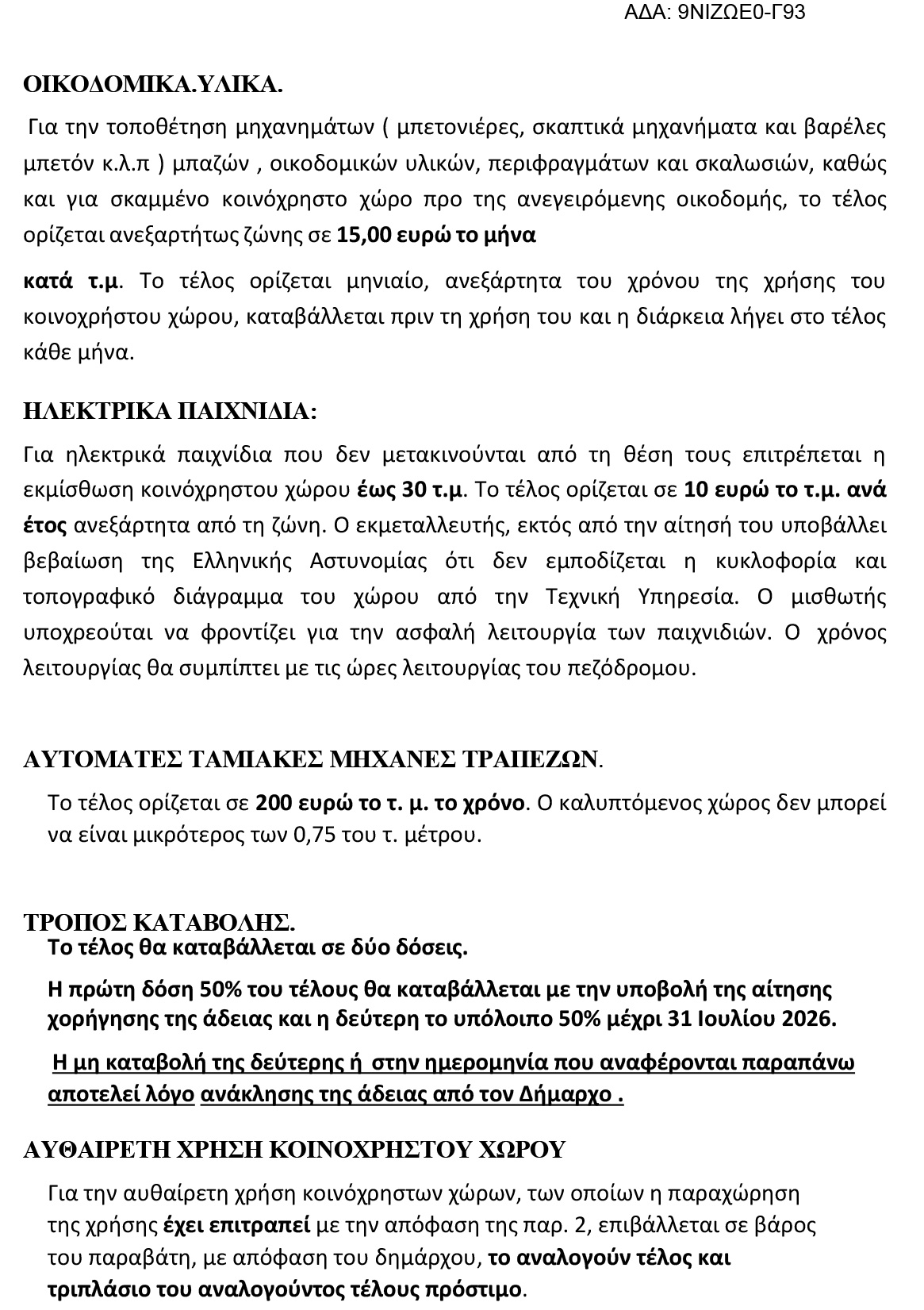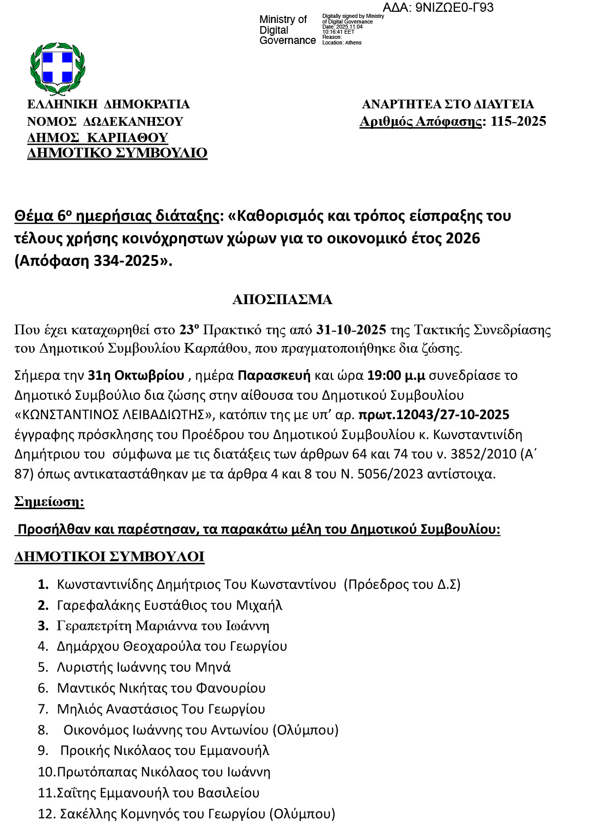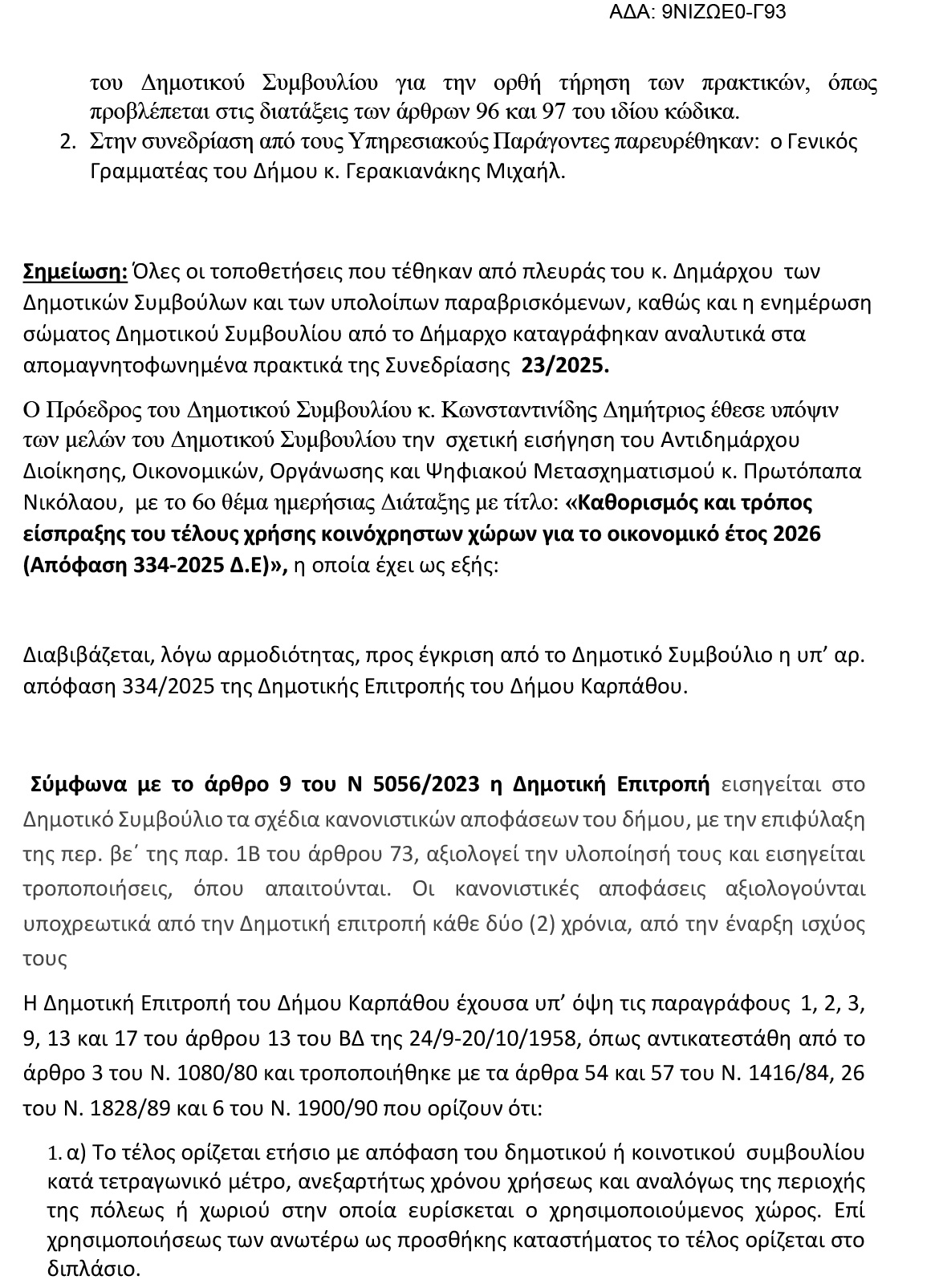Δήμος Καρπάθου: Καθορισμός και τρόπος είσπραξης του τέλους χρήσης κοινόχρηστων χώρων για το οικονομικό έτος 2026- Απόφαση Δ.Σ. 115/2025