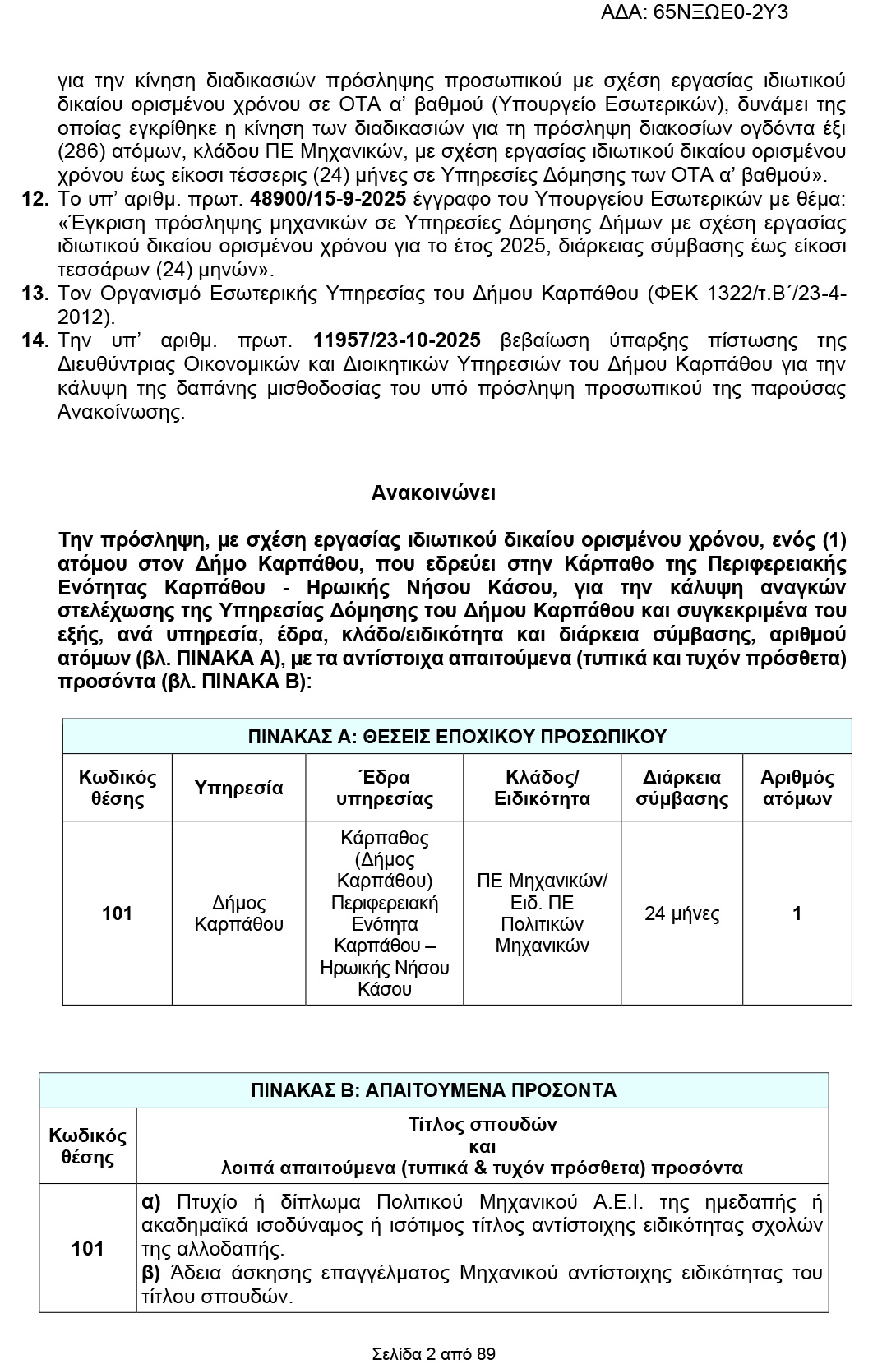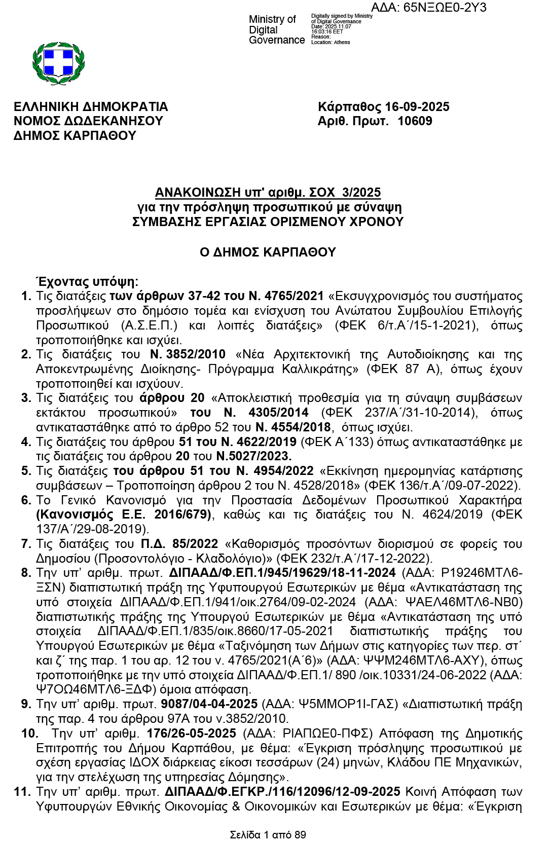 Δήμος Καρπάθου: Ανακοίνωση για την πρόσληψη προσωπικού – Ειδικότητα: Πολιτικός Μηχανικός (Σύμβαση ορισμένου χρόνου 24 μηνών) – ΣΟΧ 3/2025