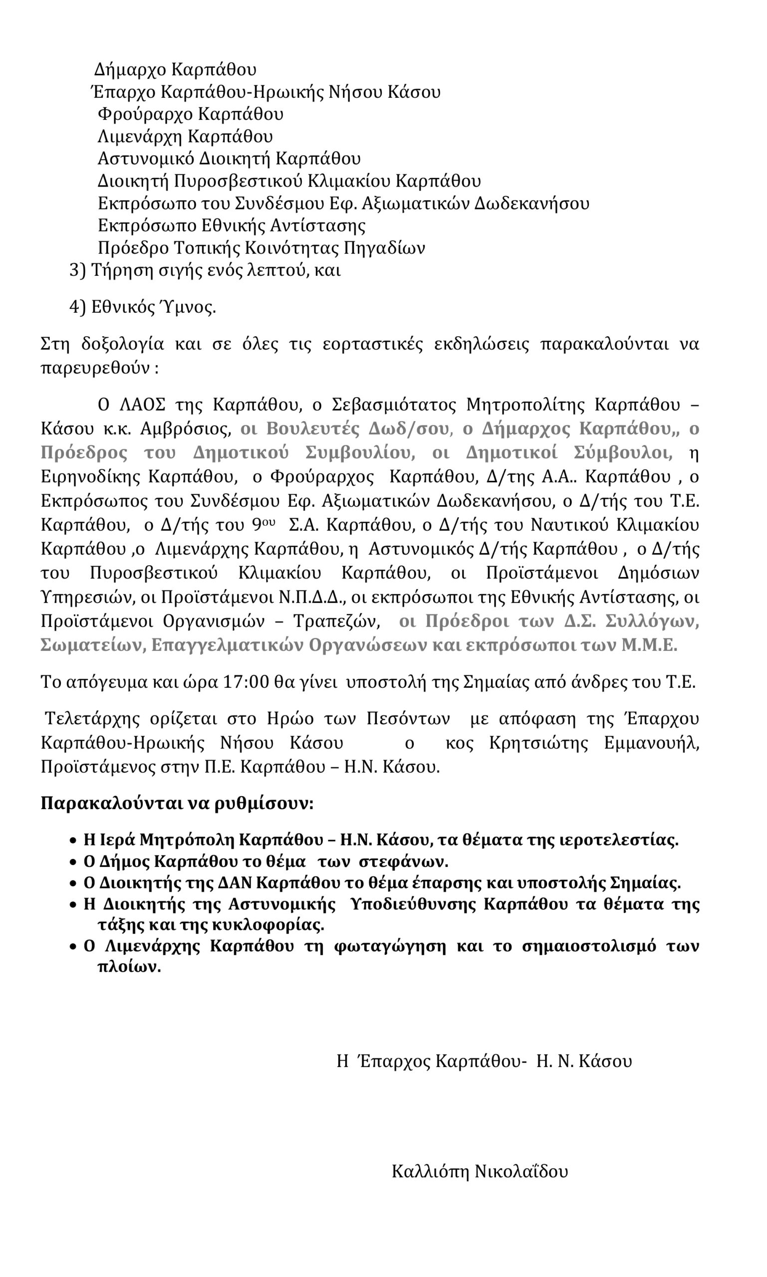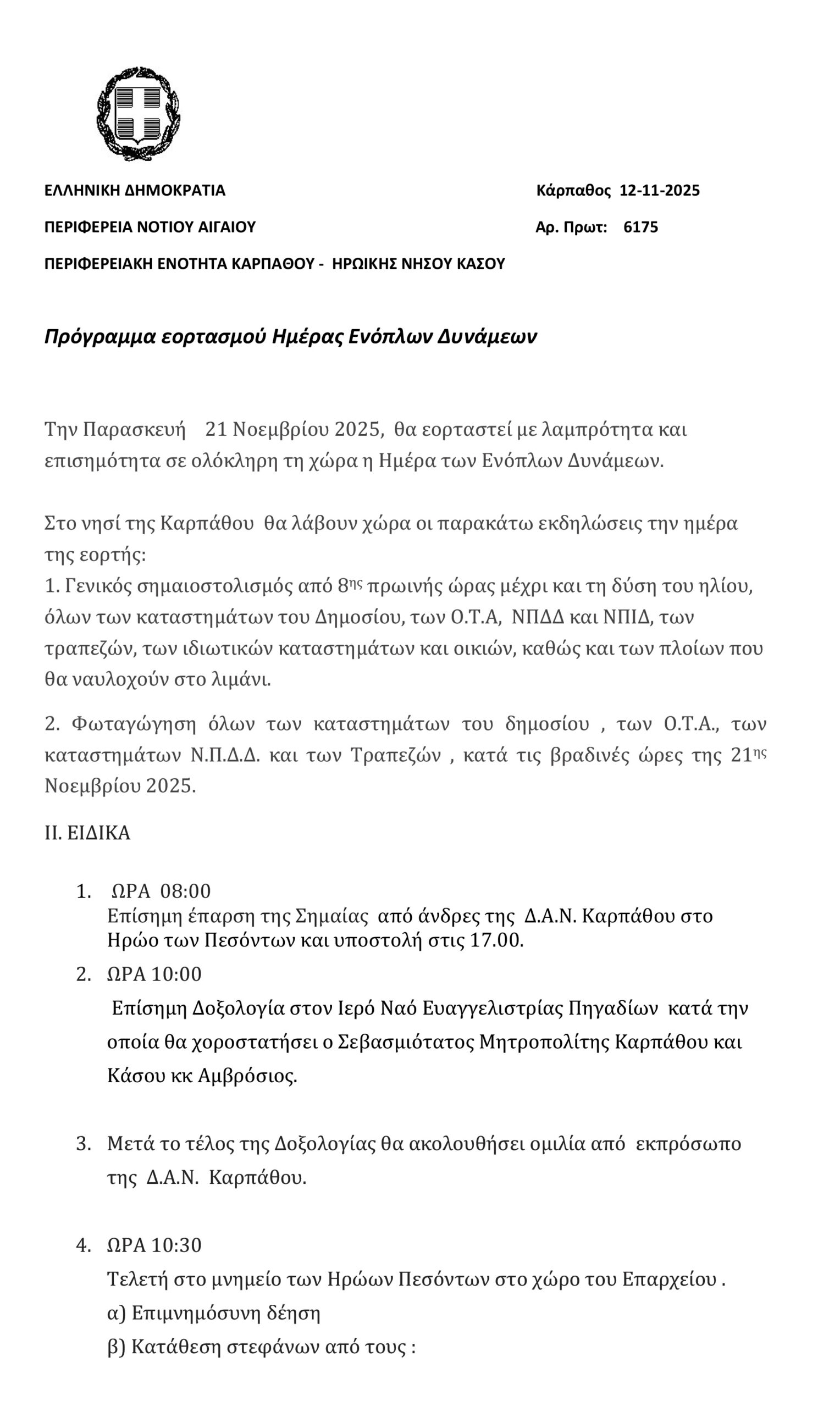 Επαρχείο Καρπάθου – Η.Ν. Κάσου: Πρόγραμμα εορτασμού Ημέρας Ενόπλων Δυνάμεων