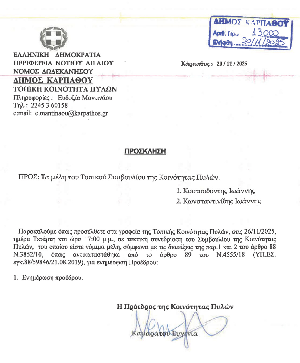 Πρόσκληση για Τακτική Συνεδρίαση της Κοινότητας Πυλών, Τετάρτη, 26/11/2025, 5:00μ.μ.