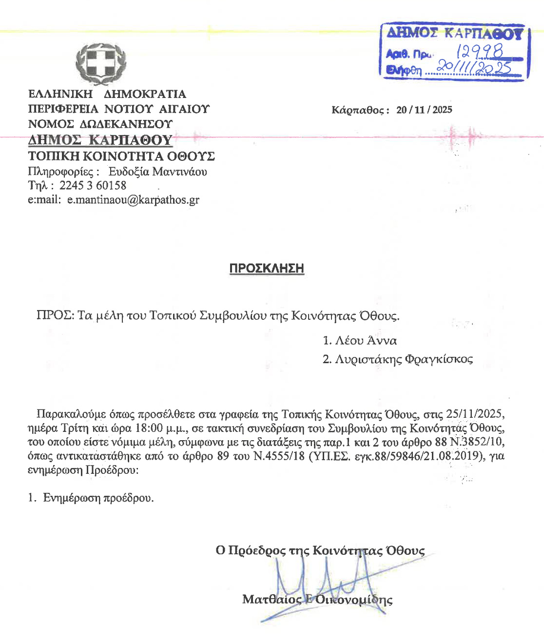 Πρόσκληση για Τακτική Συνεδρίαση της Κοινότητας Όθους, Τρίτη, 25/11/2025, 6:00μ.μ.
