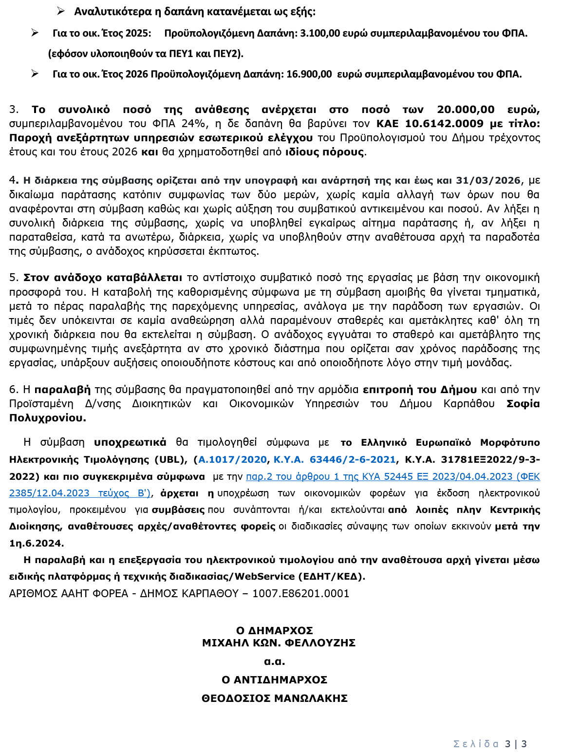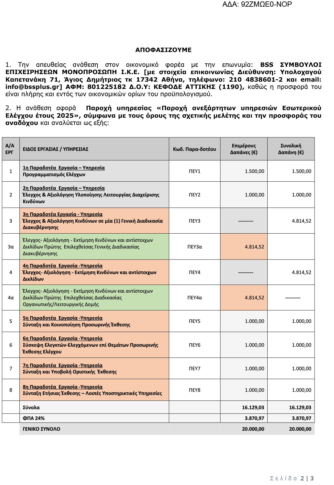 ΑΠΟΦΑΣΗ ΔΗΜΑΡΧΟΥ 1574 Απ Ανάθεση BSS ΜΟΝ ΙΚΕ υπηρεσίες εσωτερικού ελέγχου 2025