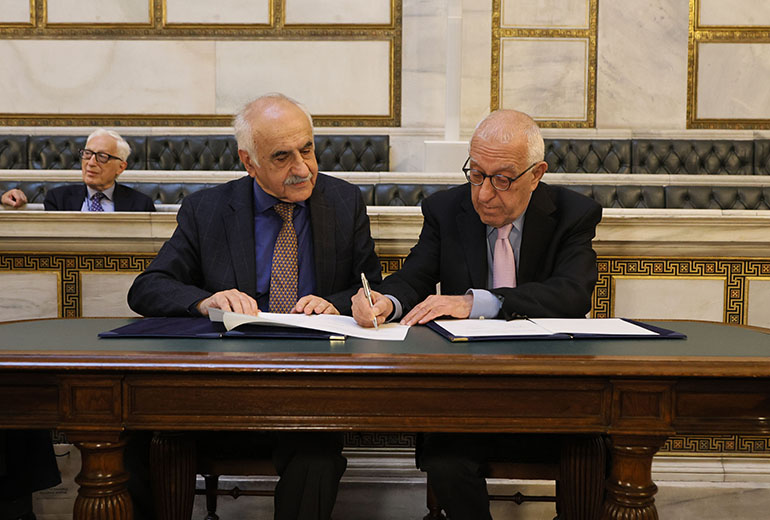 Η Βουλή των Ελλήνων και η Ακαδημία Αθηνών εγκαινίασαν σήμερα μια νέα περίοδο επίσημης συνεργασίας με την υπογραφή σχετικού Μνημονίου. Η διμερής σύμπραξη που υπεγράφη από τον Πρόεδρο της Βουλής, κ. Νικήτα Κακλαμάνη και τον Πρόεδρο της Ακαδημίας Αθηνών, κ. Μιχάλη Τιβέριο, θεσπίζει ένα πλαίσιο συνεργασίας με κύριο αντικείμενο την παροχή υψηλού επιπέδου επιστημονικών γνωμοδοτικών υπηρεσιών από την Ακαδημία Αθηνών προς το Ελληνικό Κοινοβούλιο.