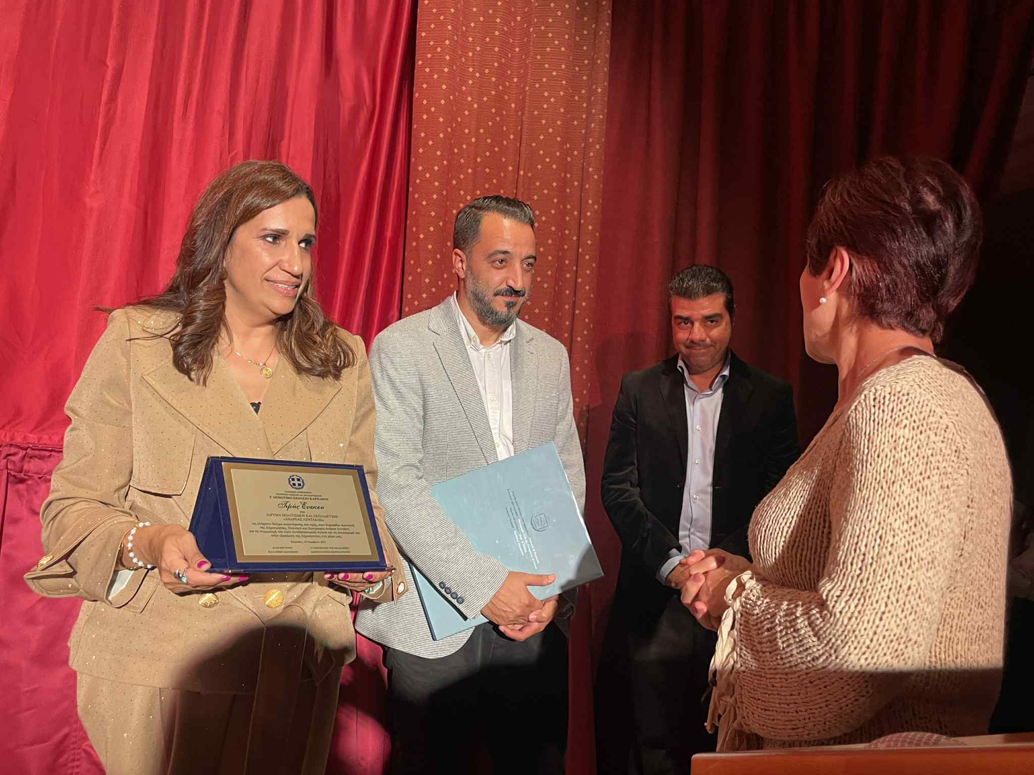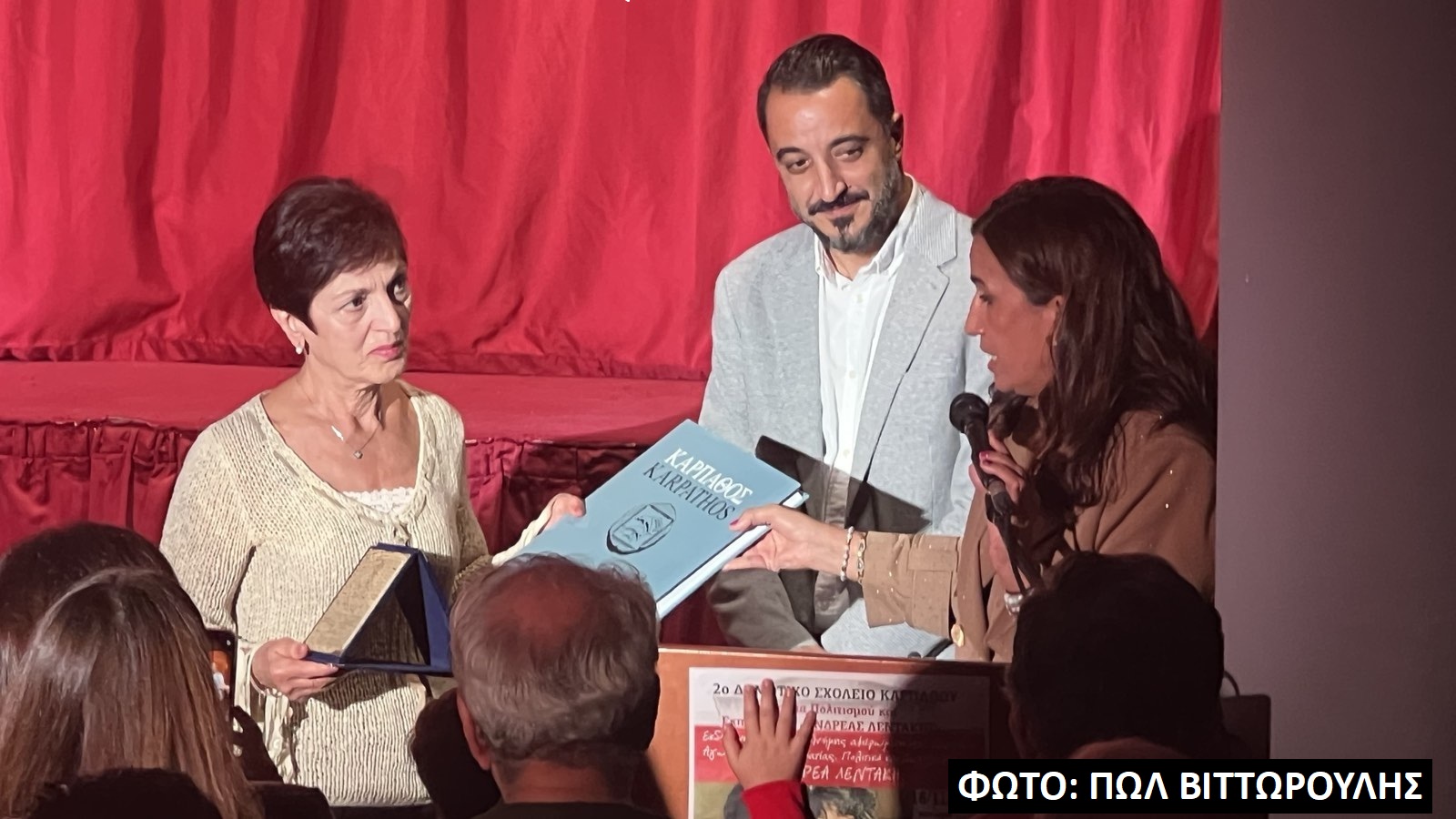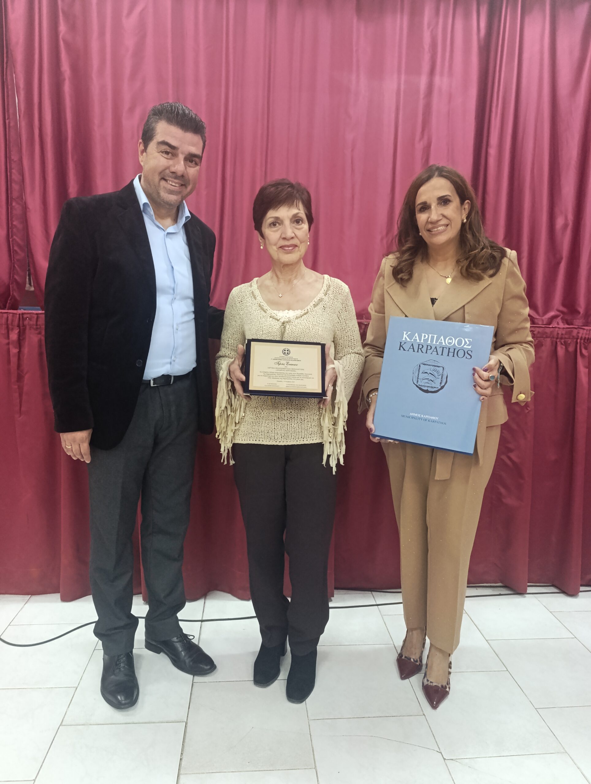 Στο τέλος της εκδήλωσης απονεμήθηκε από τη Διευθύντρια του 2ου Δημοτικού Σχολείου κα Καλλιόπη Ιωαννίδου και τον Αντιδήμαρχο Παιδείας, Δια βίου Μάθησης και Πολιτισμού κ. Τάσο Μηλιό τιμητική πλακέτα στην Πρόεδρο του Ιδρύματος Πολιτισμού και Εκπαίδευσης «Ανδρέας Λεντάκης» και σύζυγό του κα Έφη Σαβουλίδου-Λεντάκη μαζί με το βιβλίο του συμπατριώτη μας Ιωάννη Βασιλάκη με τίτλο: «Κάρπαθος & Κάσος – Οθωμανικά Φορολογικά Κατάστιχα» πρόσφατη έκδοση του Δήμου Καρπάθου.