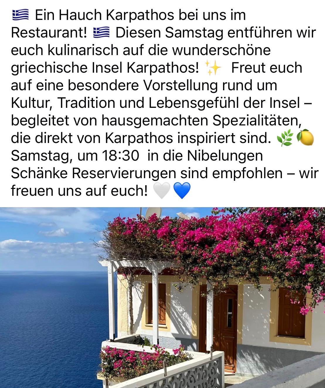 Στις 6 Δεκεμβρίου 2025 πραγματοποιήθηκε στο εστιατόριο Nibelungen Genschänke στο Ντίσελντορφ μια ξεχωριστή γαστρονομική βραδιά αφιερωμένη στις παραδοσιακές γεύσεις της Καρπάθου. Η σεφ κα. Δήμητρα Πέτσα Μηλιάδη, η οποία είχε επισκεφθεί το νησί μας για τέσσερις ημέρες τον προηγούμενο μήνα και ξεναγήθηκε σε περιοχές της Καρπάθου γνωρίζοντας από κοντά την τοπική γαστρονομία, ετοίμασε μαζί με τον κ. Διονύσιο Μηλιάδη ένα αυθεντικό μενού στοχευμένο στην επιτυχημένη παρουσίαση της κουζίνας του νησιού.