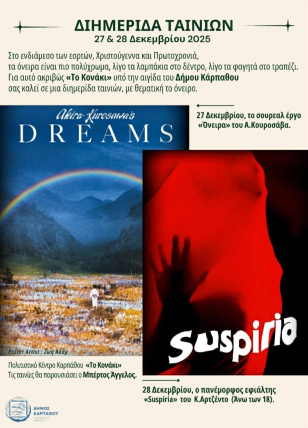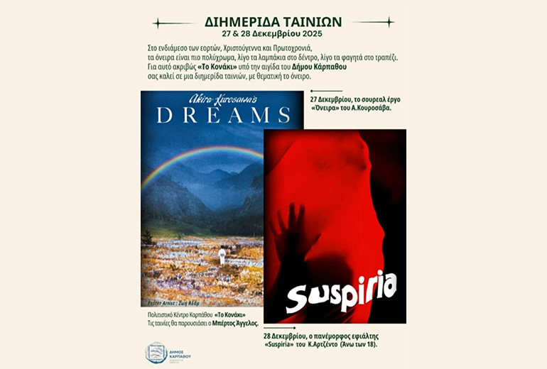 Διημερίδα κινηματογράφου με θεματική το όνειρο διοργανώνει ο Δήμος Καρπάθου στο Πολιτιστικό Κέντρο Καρπάθου «Το Κονάκι», στις 27 και 28 Δεκεμβρίου 2025.