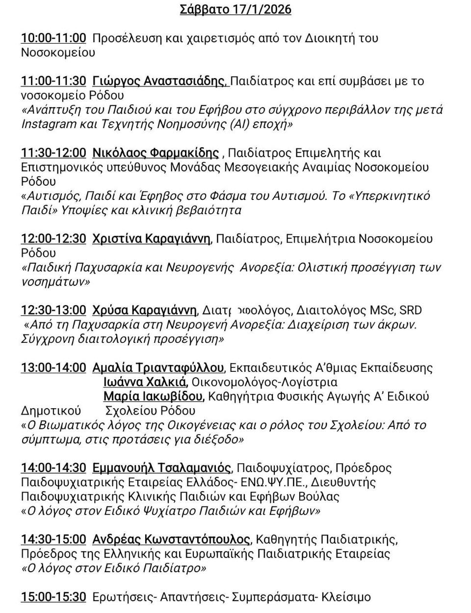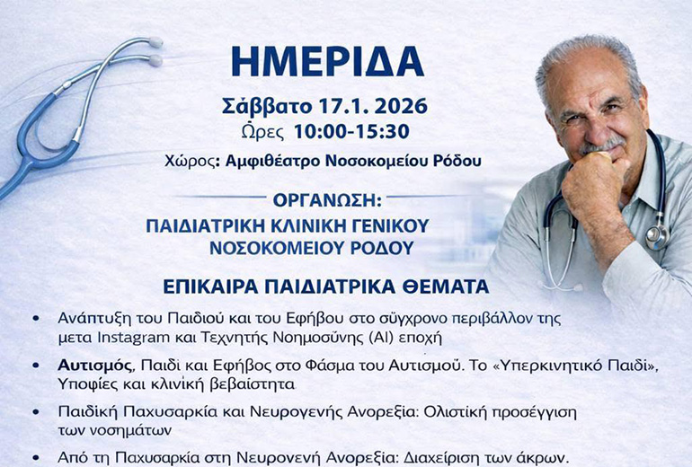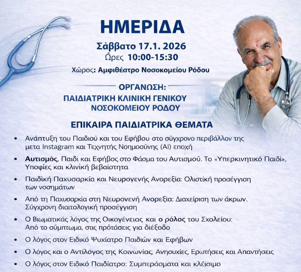 Στην ημερίδα θα μιλήσει και ο συμπατριώτης μας από την Όλυμπο Καρπάθου Δρ Γιώργος Αναστασιάδης, παιδίατρος και επί συμβάσει με το Νοσοκομείο Ρόδου με θέμα «Ανάπτυξη του Παιδιού και του Εφήβου στο σύγχρονο περιβάλλον της μετά Instagram και Τεχνικής Νοημοσύνης (Α) εποχής»