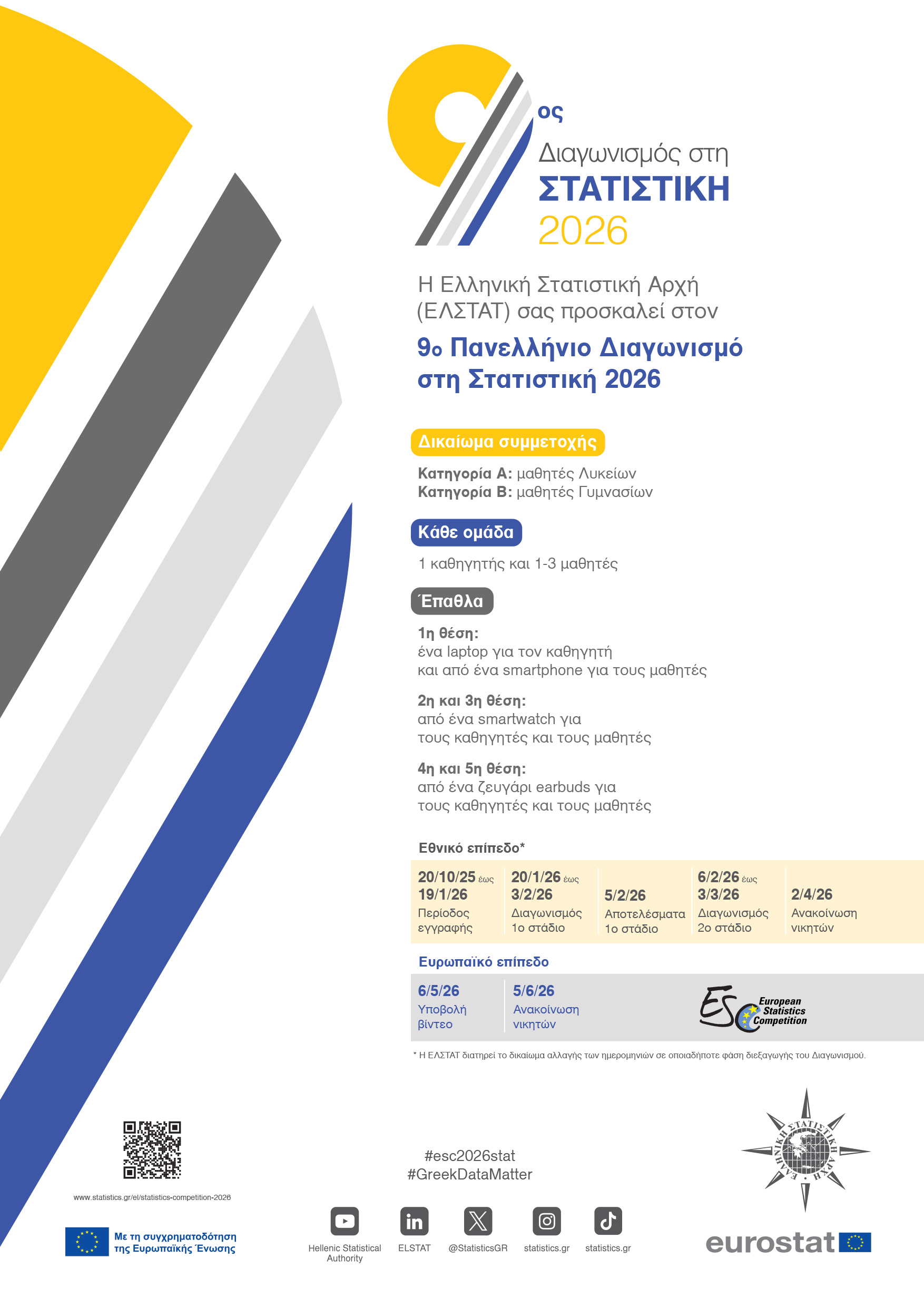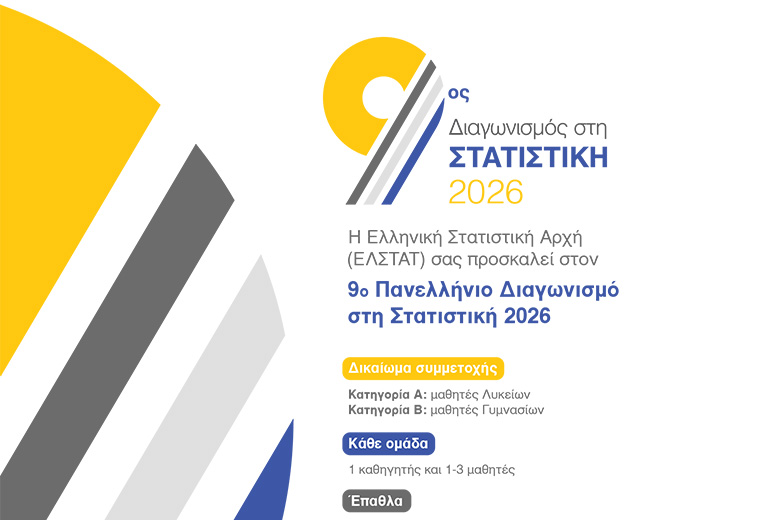 Η Ελληνική Στατιστική Αρχή (ΕΛΣΤΑΤ), στο πλαίσιο της στρατηγικής της για την «Ανάπτυξη της Στατιστικής Παιδείας στην Ελλάδα», διοργανώνει για ένατη συνεχή χρονιά τον «Πανελλήνιο Διαγωνισμό στη Στατιστική», από τον Οκτώβριο 2025 έως και τον Απρίλιο 2026.