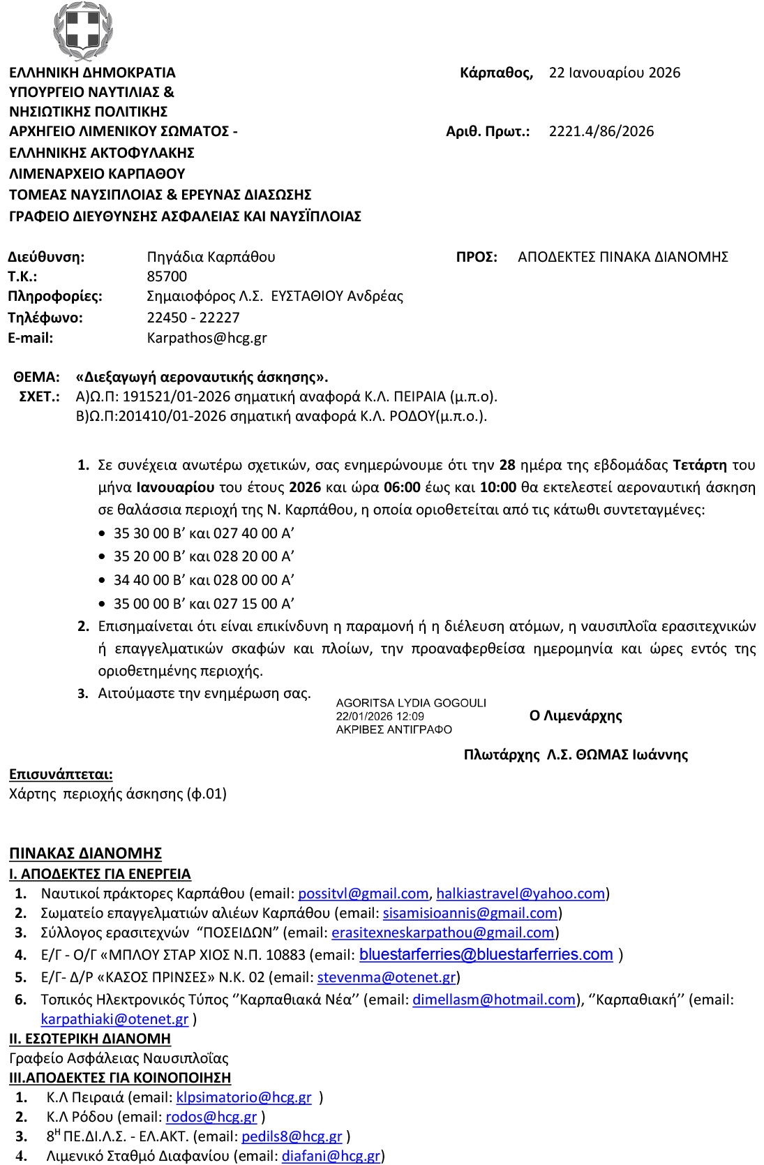 Σε συνέχεια ανωτέρω σχετικών, σας ενημερώνουμε ότι την 28 ημέρα της εβδομάδας Τετάρτη του μήνα Ιανουαρίου του έτους 2026 και ώρα 06:00 έως και 10:00 θα εκτελεστεί αεροναυτική άσκηση σε θαλάσσια περιοχή της Ν. Καρπάθου, η οποία οριοθετείται από τις κάτωθι συντεταγμένες: