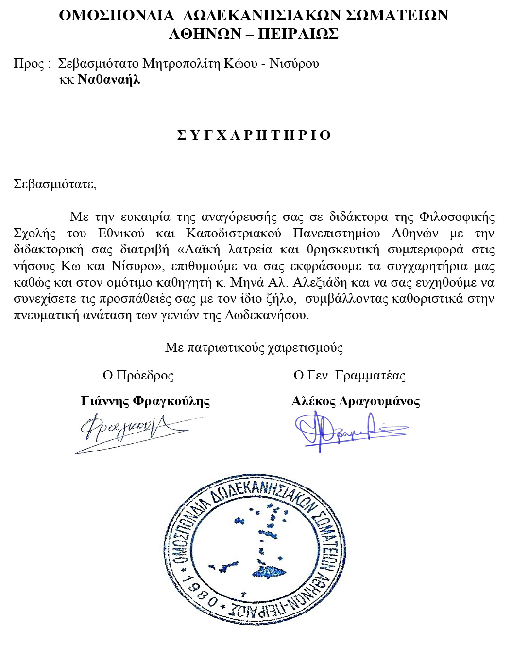 - 23/1: Στάλθηκε συγχαρητήριο στο νέο πρόεδρο του Πανελλήνιου Ιατρικού Συλλόγου, κ. Κώστα Κοτσόπουλο, Ροδιακής καταγωγής