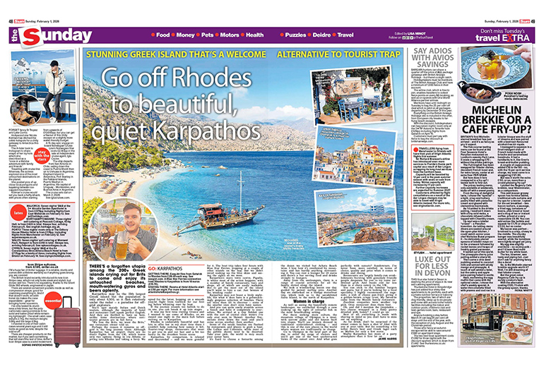 Εκτενές ταξιδιωτικό αφιέρωμα για την Κάρπαθο στη Βρετανική εφημερίδα The Sun (Sunday edition), ένα από τα μεγαλύτερα σε κυκλοφορία μέσα ενημέρωσης στο Ηνωμένο Βασίλειο με δεκάδες εκατομμύρια αναγνώστες σε Μ. Βρετανία, Αμερική και Ευρώπη στην έντυπη και ψηφιακή εκδοση. Το δημοσίευμα προέκυψε έπειτα από δημοσιογραφικό ταξίδι (press trip) που υλοποιήθηκε τον περασμένο Μάϊο με πρωτοβουλία και υποστήριξη του Δήμου Καρπάθου σε συνεννόηση με εξειδικευμένους συμβούλους τουρισμού.